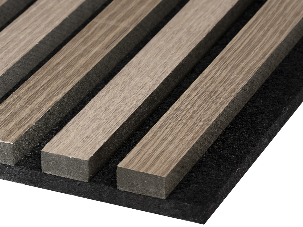 Akustikpaneele Wandverkleidung Smoke Oak 120 cm21 mm stark, 120 x 61 cm, MDF-Lamellen mit Eichenfurnier naturbelassen, auf Trägerplatte