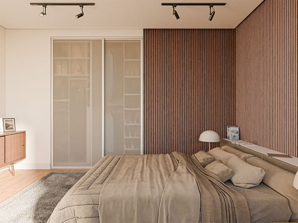 - Die Beplankung einer kompletten Zimmerwand mit Akustikpaneelen (22 mm) bewirkt eine Schallreduktion um ca. 25 %, abhängig von weiteren Faktoren*
