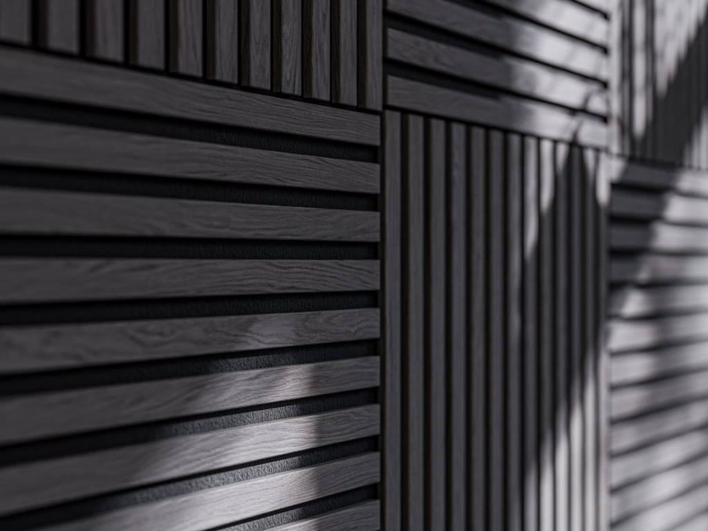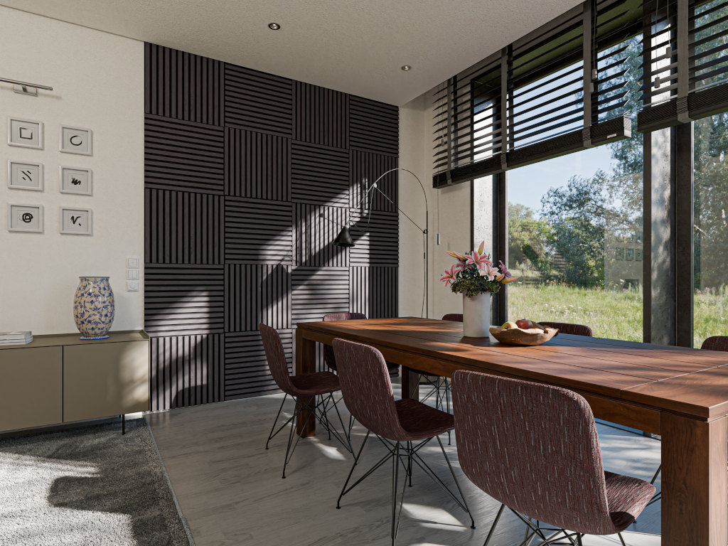 Modernes Design & perfekte Raumakustik: Das dekorative Akustik-Wandpaneel im Design Black Oak wertet jeden Wohnraum optisch auf und sorgt dank seiner einzigartigen akustischen Eigenschaften für eine behagliche Atmosphäre.