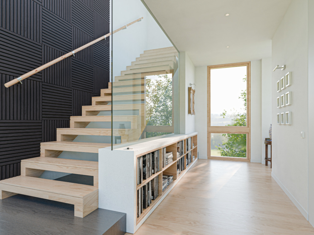 Die Paneele bestehen aus einer Trägerplatte, auf der Lamellen aus Holz angebracht sind. Diese besondere Struktur ermöglicht eine optimale akustische Regulierung und Nachhalldämpfung.