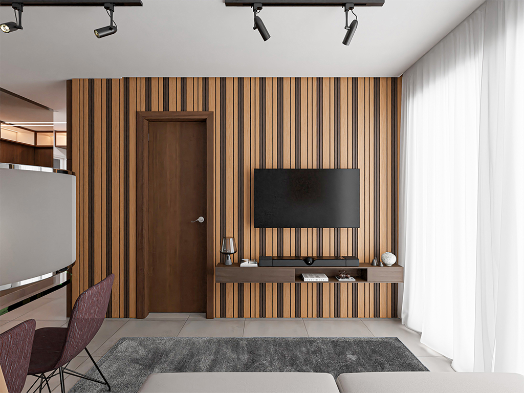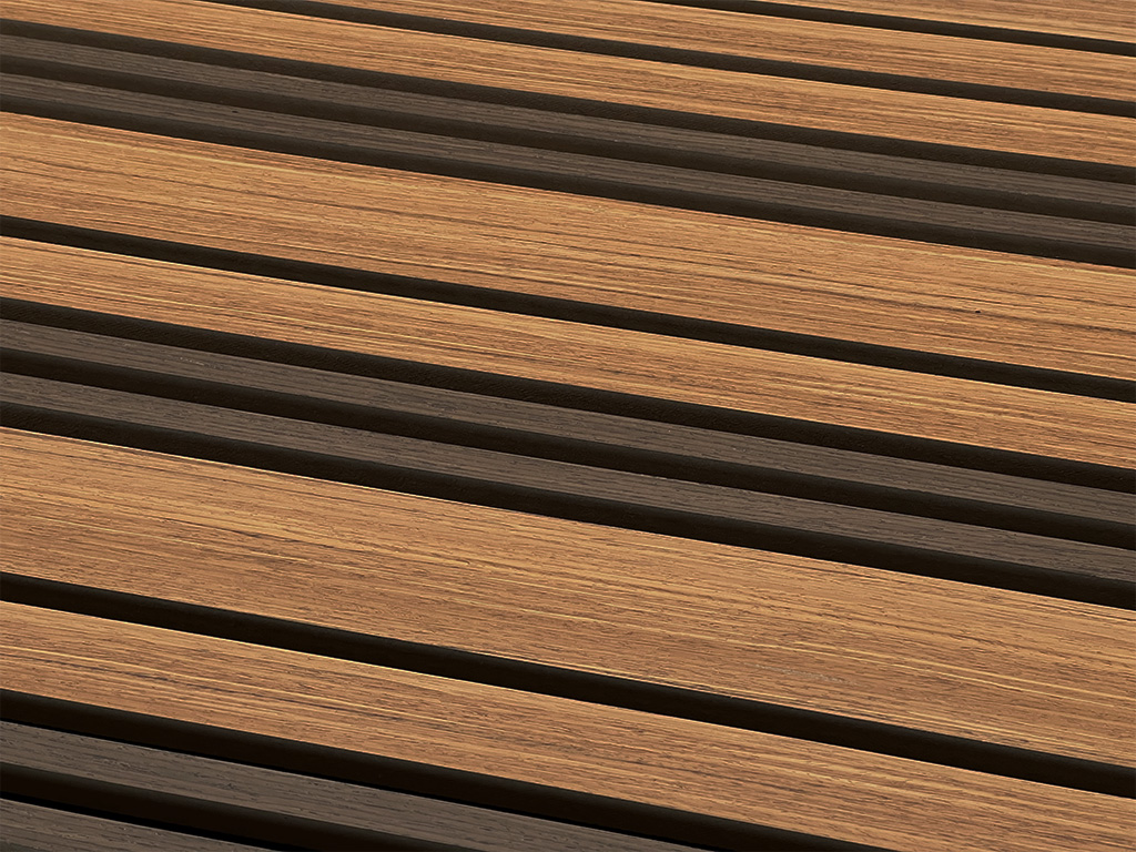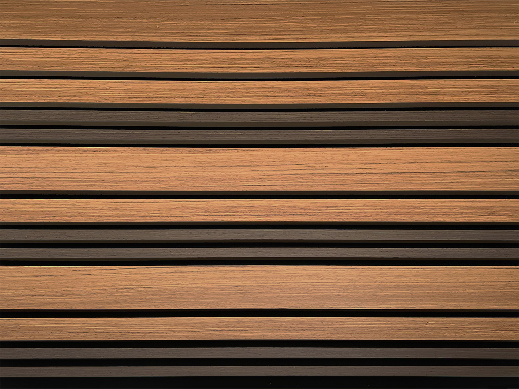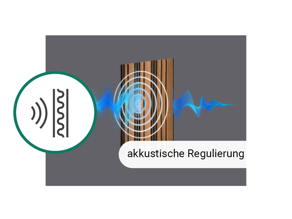 Akustikpaneele dienen der Gestaltung von Wänden und Decken. Zusätzlich stehen die akustischen Eigenschaften der Produkte im Vordergrund. Die Paneele haben eine schwarze Trägerplatte aus recyceltem, schallabsorbierenden Polyester, auf denen Lamellen (MDF) angebracht sind, die mit astfreier Eiche furniert sind.