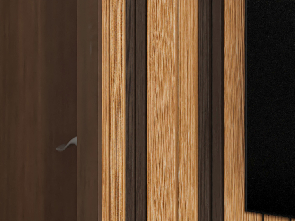 Akustikpaneele dienen der Gestaltung von Wänden und Decken. Zusätzlich stehen die akustischen Eigenschaften der Produkte im Vordergrund. Die Paneele haben eine schwarze Trägerplatte aus recyceltem, schallabsorbierenden Polyester, auf denen Lamellen (MDF) angebracht sind, die mit astfreier Eiche furniert sind.