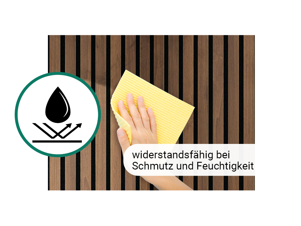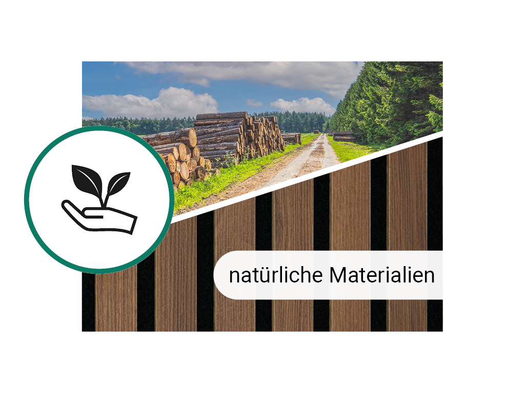 Die Akustikpaneele dienen der Gestaltung von Wänden und Decken. Zusätzlich stehen die akustischen Eigenschaften der Produkte im Vordergrund. Die Paneele haben eine Trägerplatte aus schallabsorbierendem, schwarzem Filz (vegan) mit einem hohen Recyclinganteil von 70%, auf denen Lamellen (MDF) angebracht sind.