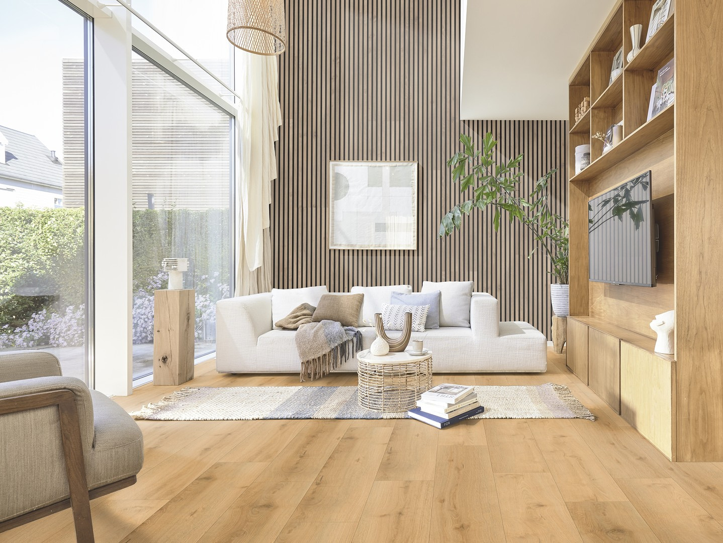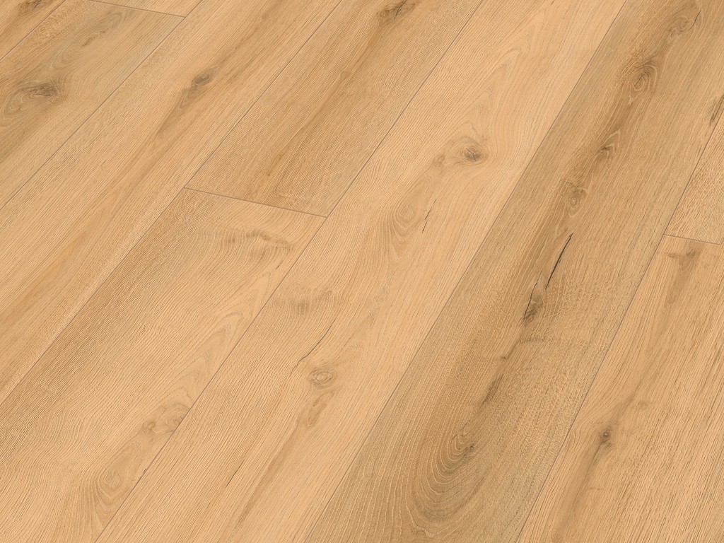 Das Dekor in authentischer Eichenholzoptik vermittelt fühlbare Wärme und Behaglichkeit. Die rustikal wirkenden Landhausdielen betonen mit ihrer 1-Stab-Optik den traditionellen Charakter der Holzoptik. Die an vier Seiten umlaufende Fase strukturiert das Verlegebild und verleiht ihm ein gleichmäßiges Muster. Dank modernster Prägetechnologien ist die strukturierte Oberfläche bis ins kleinste Detail der Beschaffenheit von Holz nachempfunden.
