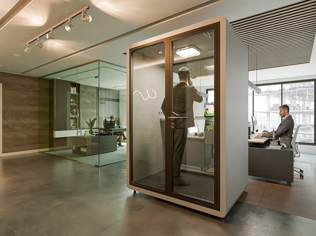 Die Telefon- und Meetingbox Secundo bietet eine effektive Rückzugsmöglichkeit für ungestörte Gespräche oder fokussiertes Arbeiten in offenen Büroumgebungen. Mit ihren kompakten Außenmaßen von 158,8 x 118,8 x 230 cm (L x T x H) ist sie für zwei Personen ausgelegt und lässt sich flexibel im Raum positionieren. Die Kombination aus schallgedämmter Konstruktion (Reduktion um 35 Dezibel) und doppelverglaster Tür sorgt für eine ruhige Atmosphäre im Inneren – ideal für Telefonate oder virtuelle Meetings.