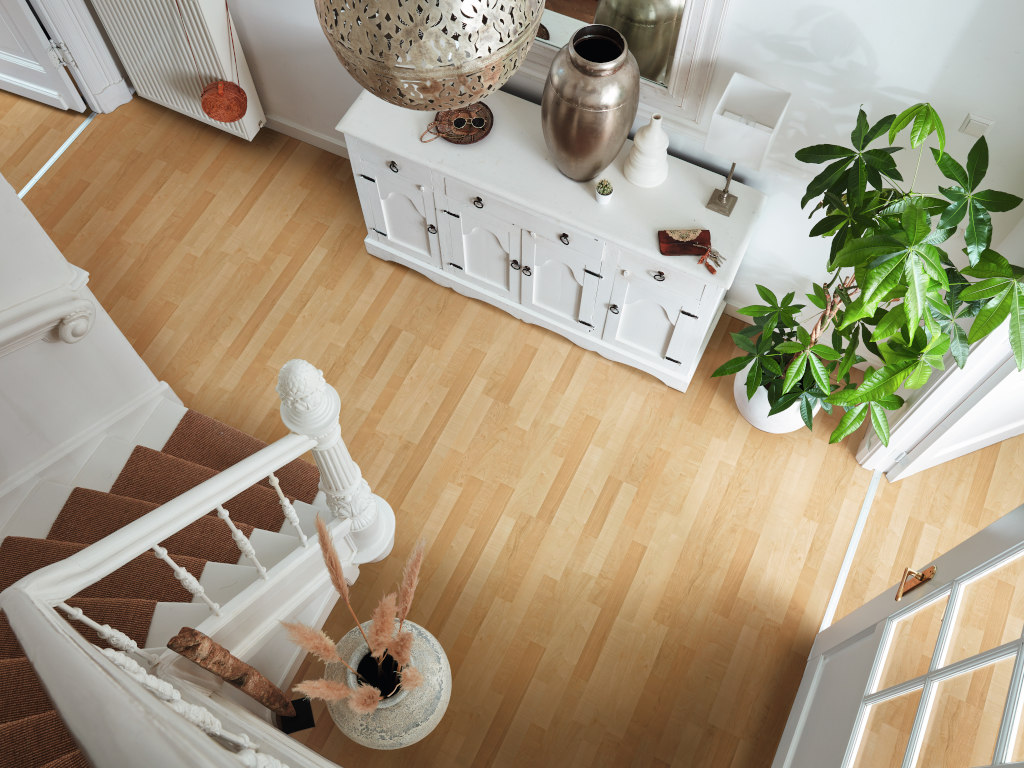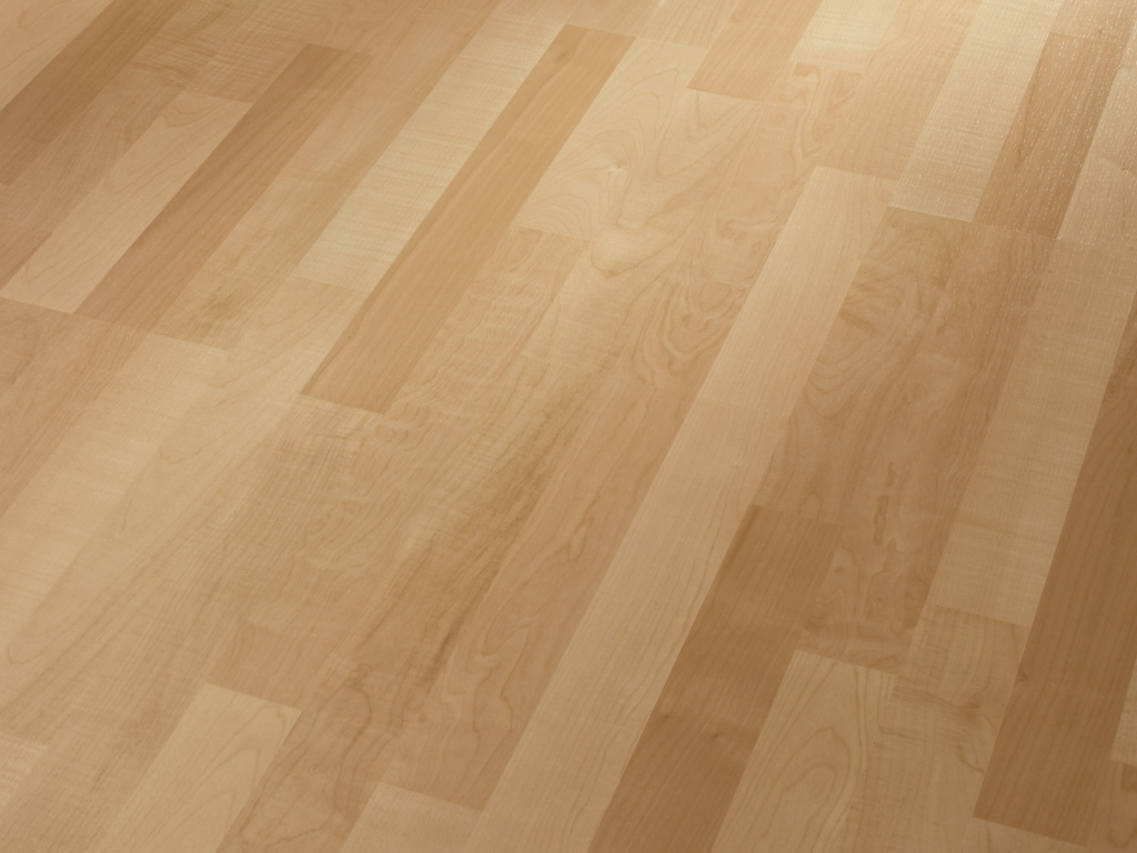Die helle und ebenmäßige Maserung des Ahorn-Dekors bringt alle optischen Eigenschaften eines echten Ahornbodens mit.