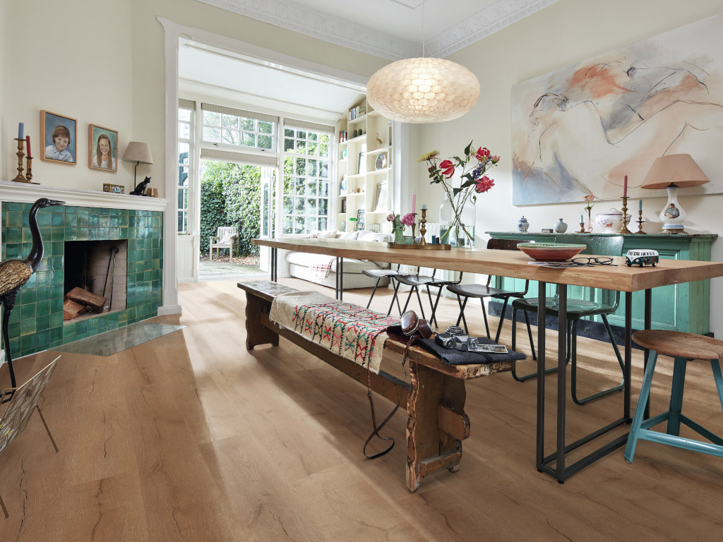 Das Dekor mit typischer Eichenholzmaserung charakterisiert perfekt den Stil der rustikalen Moderne. Das Multistabdesign wirkt durch die individuelle Stabkombination unterschiedlicher Längen und Farben herrlich lebendig. So erzählt jede Diele ihre eigene Geschichte. Die 4-seitig umlaufende V-Fuge betont die Dielenoptik. Dank der strukturierten Oberfläche entsteht optisch und fühlbar der Eindruck eines echten Holzbodens.