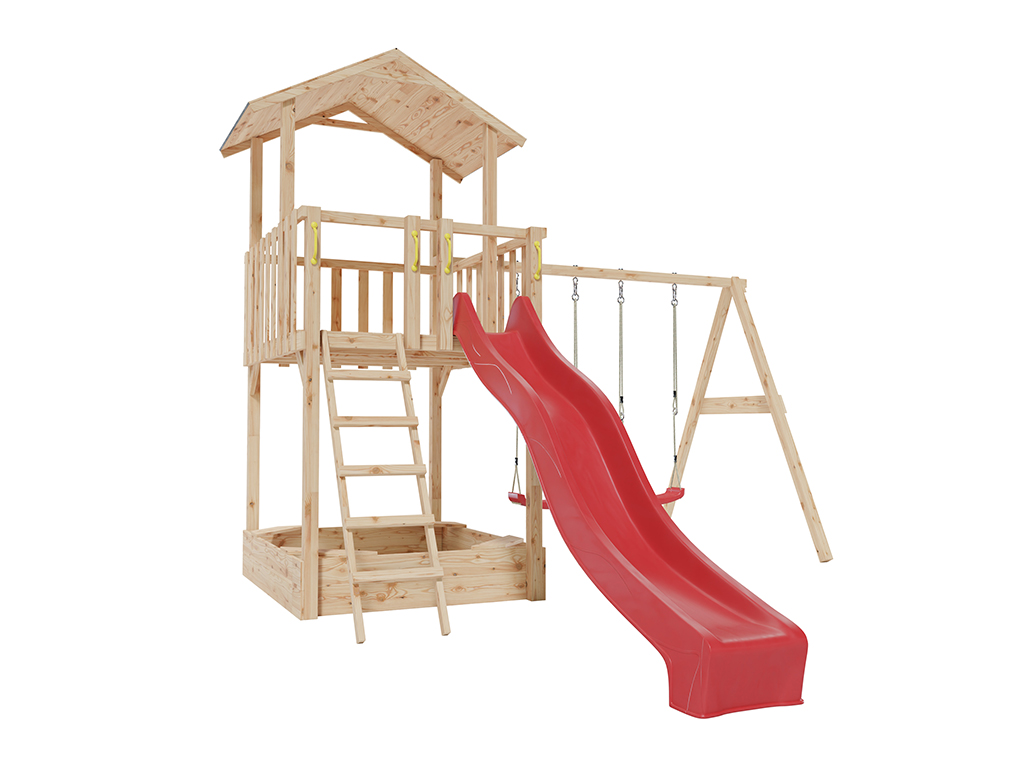 | Lieferumfang: | Spielturm Tilly Premium Lärche, Doppelschaukel (ohne Schaukelsitze), 4 Schaukelhaken, Sandkasten, Wellenrutsche |