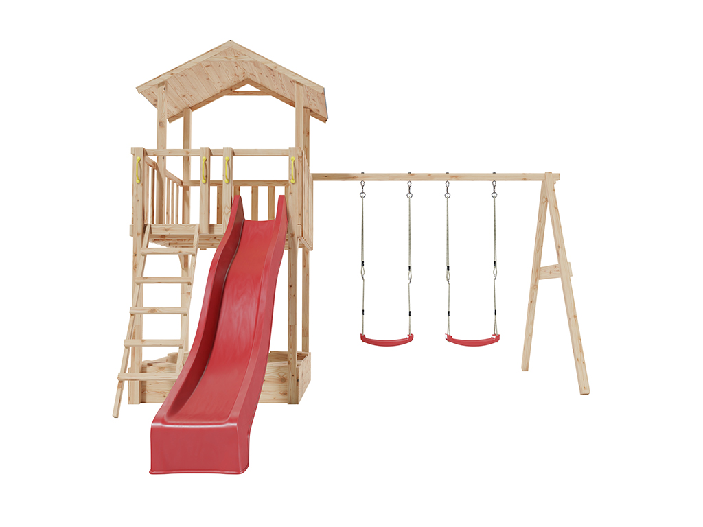 Die großzügige und zum Teil überdachte 145 cm hohe Plattform wird über eine stabile Leiter mit aufgesetzten Holzsprossen erreicht. Für die Sicherheit deines Kindes sind bereits vier Haltegriffe im Lieferumfang enthalten. - Inkl. Doppelschaukel