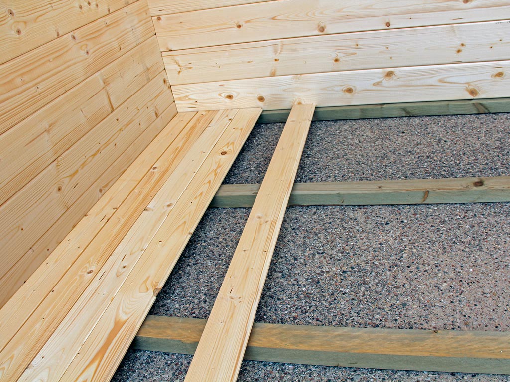 Bereits im Lieferumfang enthalten sind Unterleghölzer, auf denen die Bodenbretter montiert werden. - Inhalt passend für 1,5 m² Innenfläche