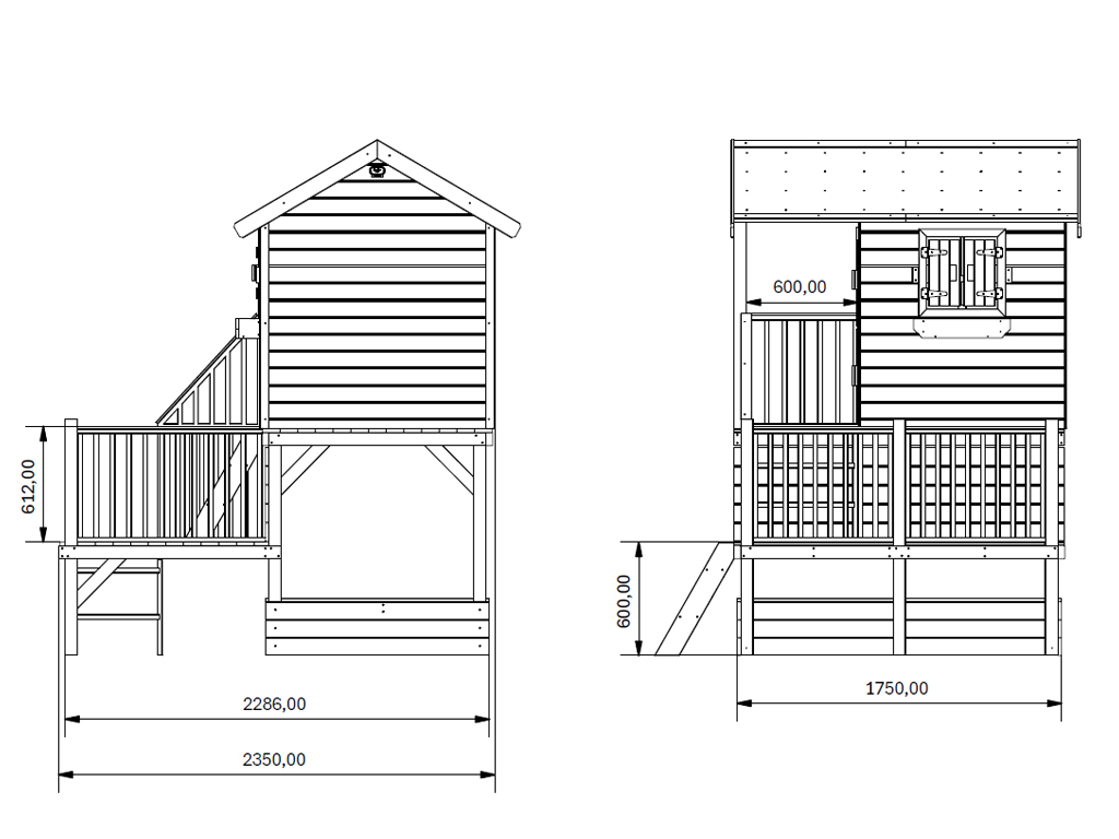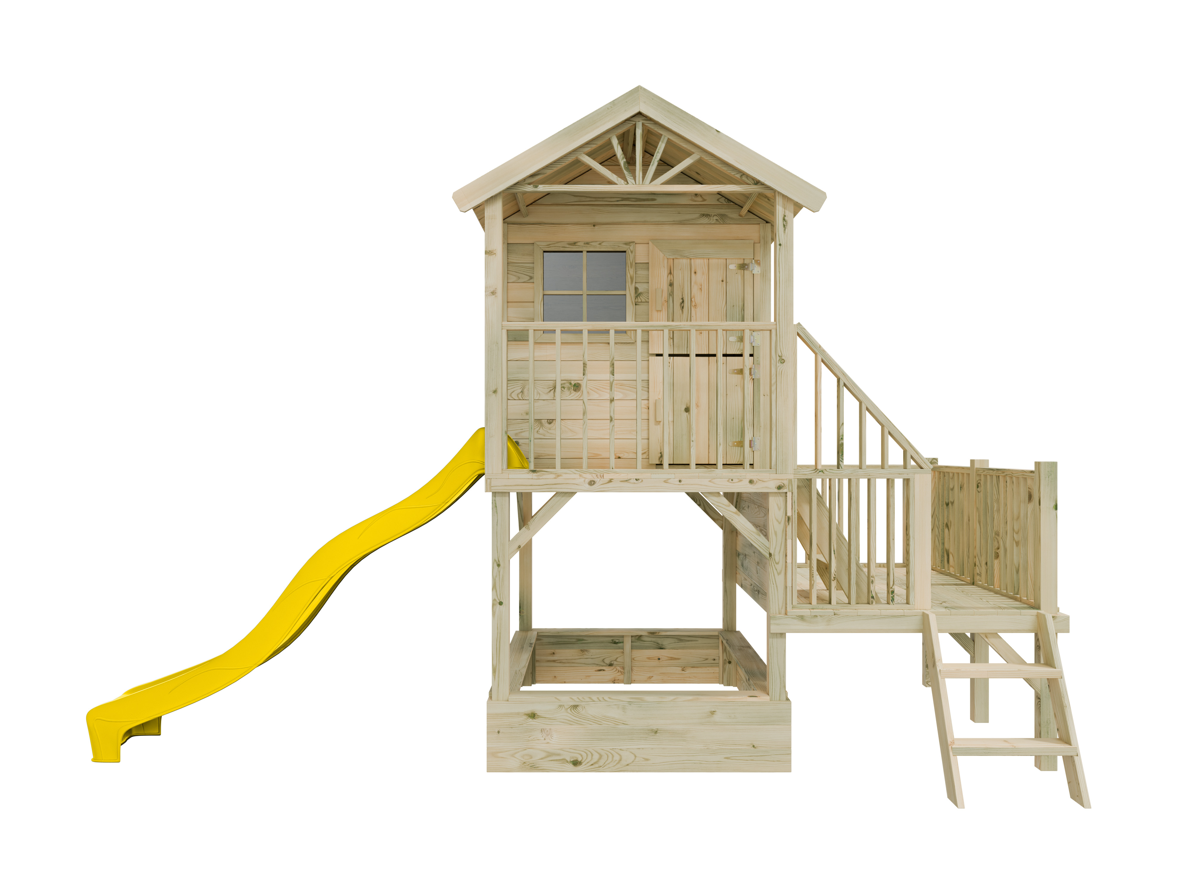 B x T x H: 232,1 x 219 x 273 cm, inkl. Sandkasten und Rutsche, zwei Podeste (120 cm und 60 cm)