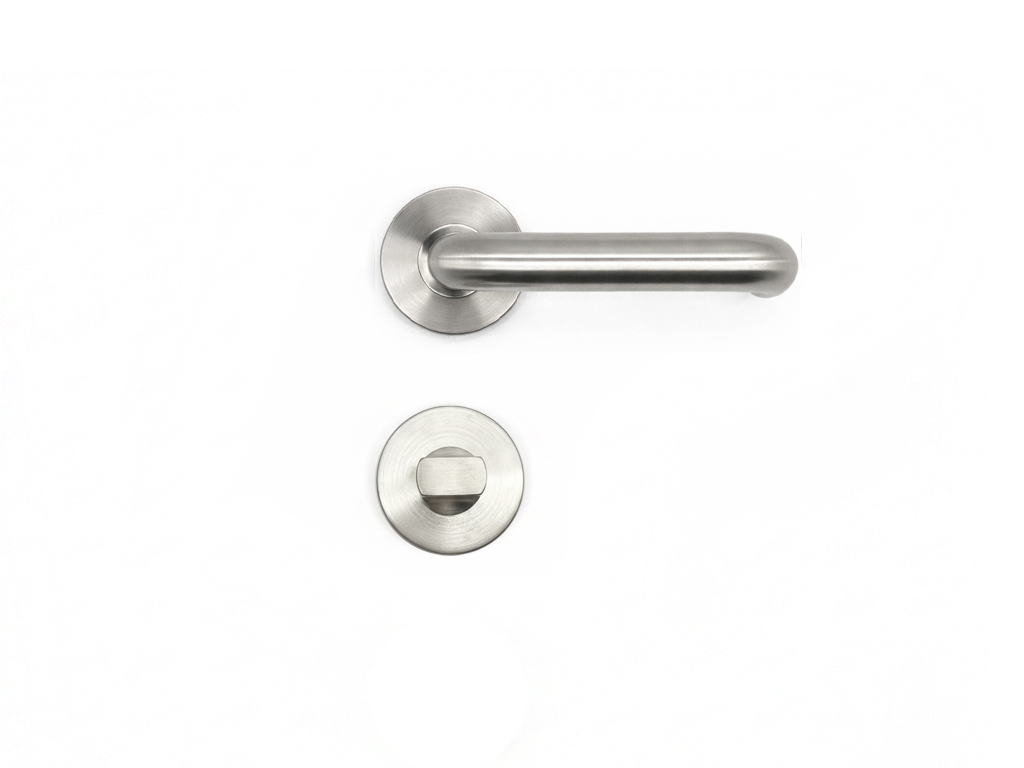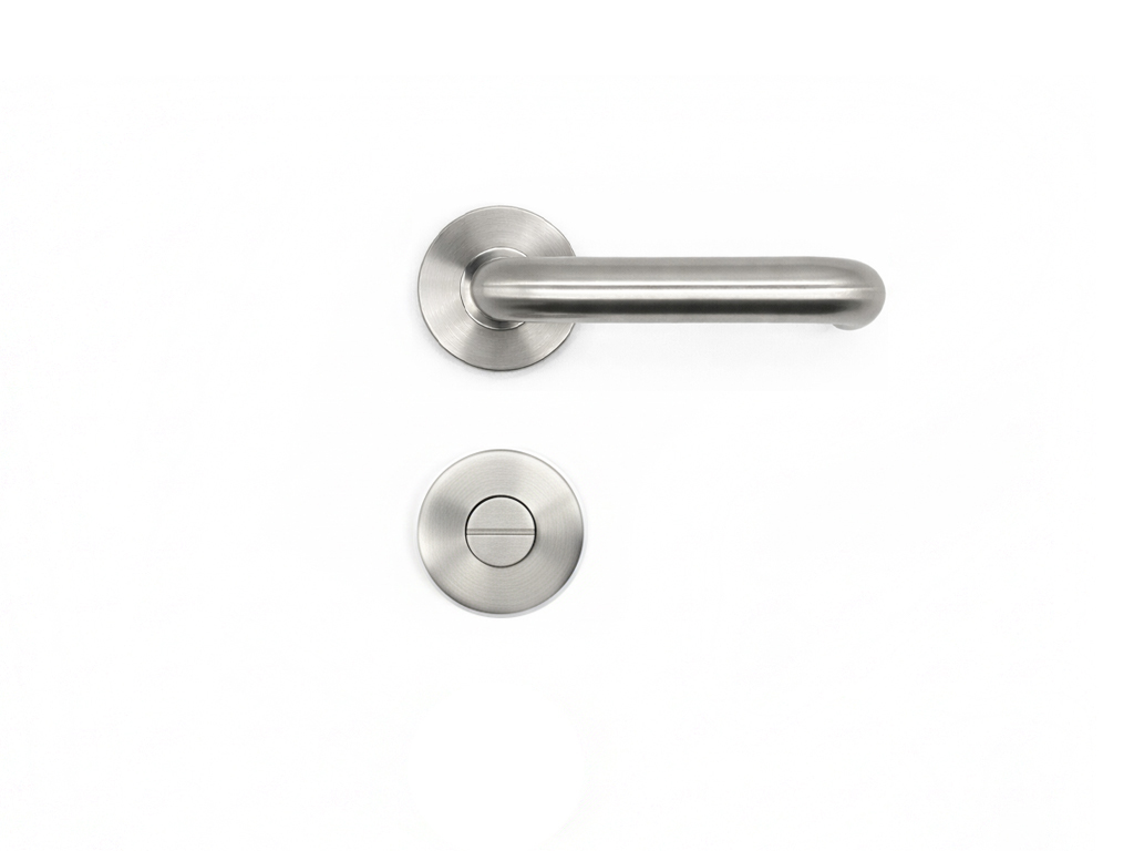Drückergarnitur in WC-Ausführung mit rundem U-Form-Griff und runden Klipprosetten, Edelstahl matt.