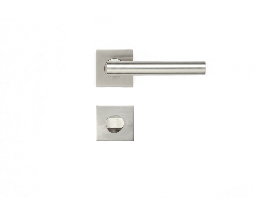 Drückergarnitur in WC-Ausführung mit rundem L-Form-Griff und eckigen Klipprosetten, Edelstahl matt.