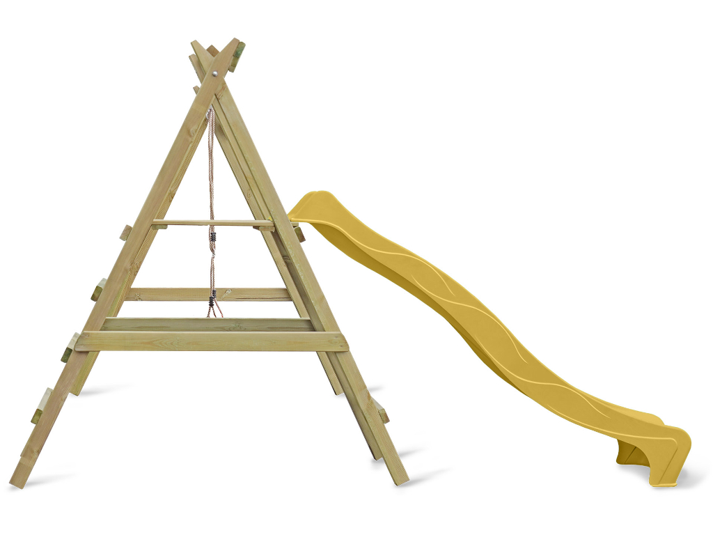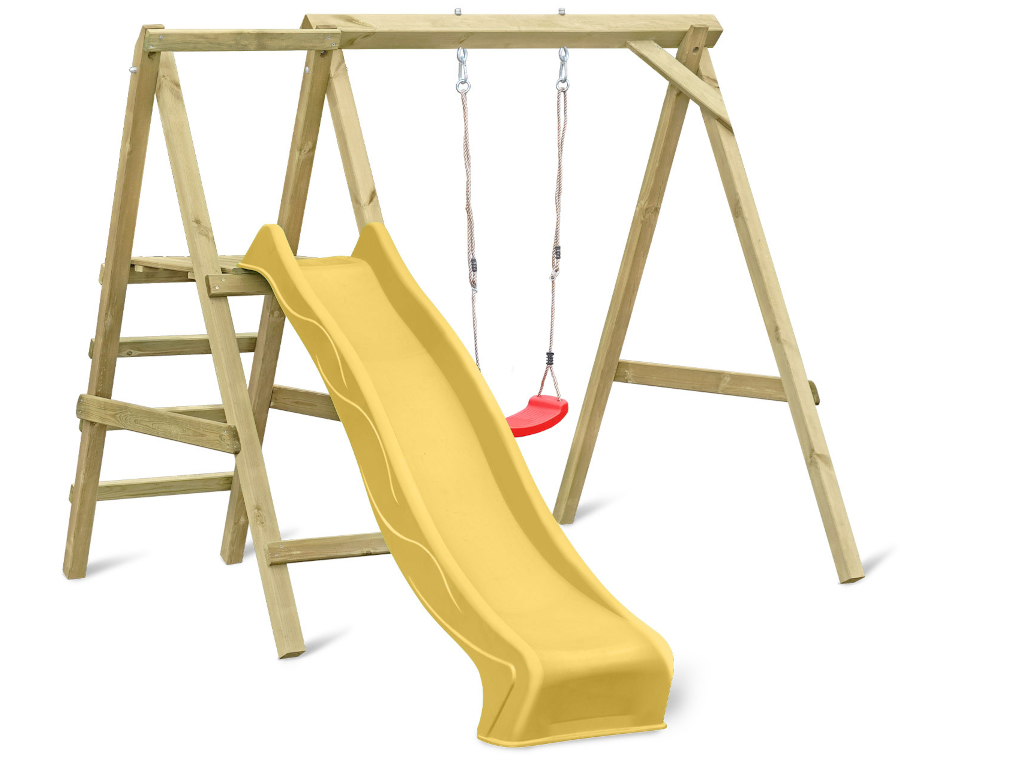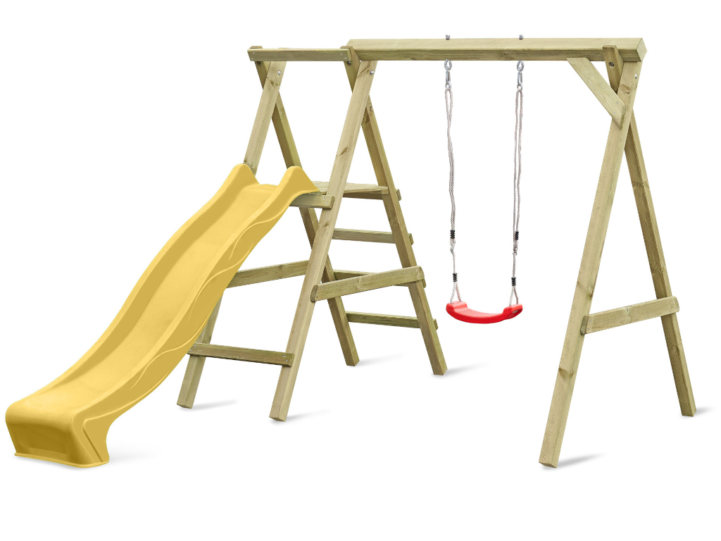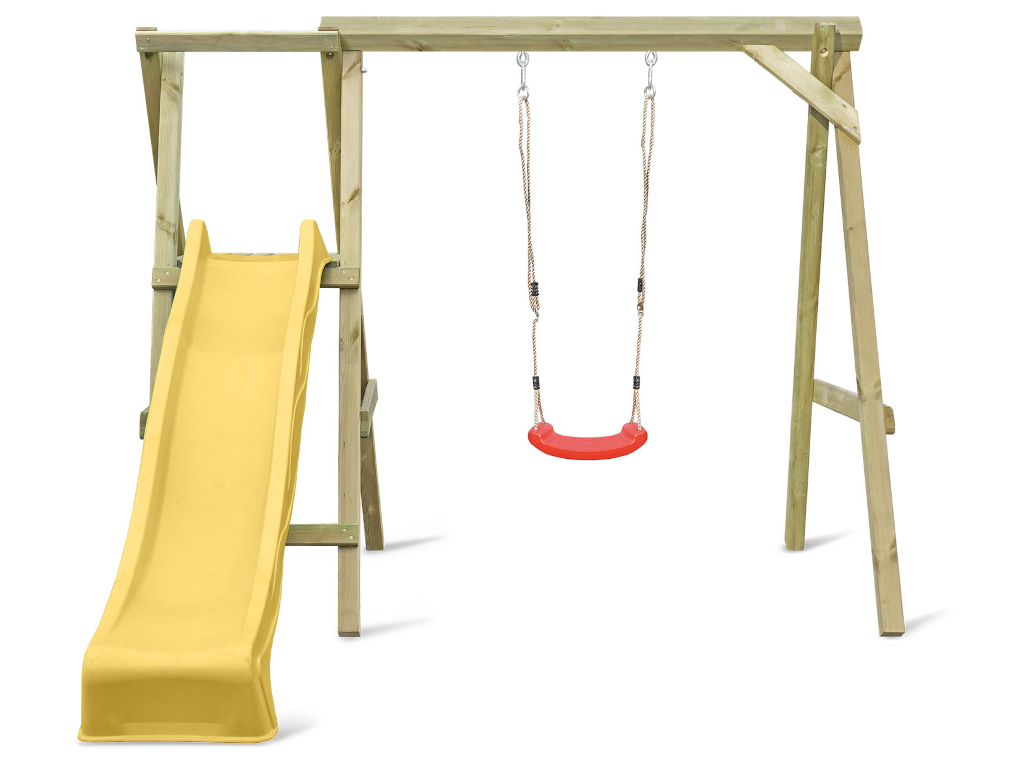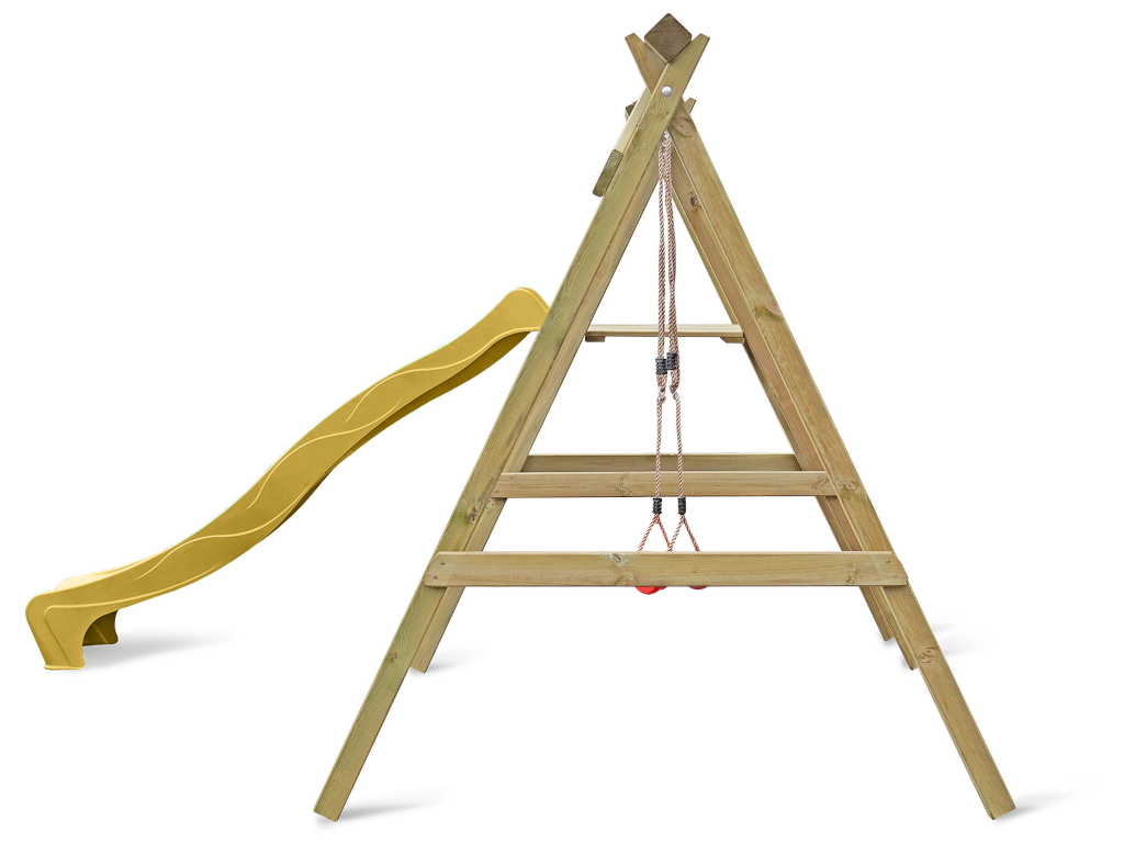 Bei einer Schaukel ist Spaß vorprogrammiert – sie sollte in keiner Kindheit fehlen. Schaukeln ist einfach aufregend und nicht umsonst bei Kindern bis ins Jugendalter und auch bei manchen Erwachsenen noch sehr beliebt. Die allgemeine Altersempfehlung für Schaukeln liegt bei 3–12 Jahren, für das Gefühl von Leichtigkeit und Freiheit gibt es nach oben hin aber keine Altersbegrenzung. Wer sich nicht entscheiden möchte, ob er lieber schaukeln oder rutschen möchte, trifft mit diesem Modell die richtige Wahl – hier ist gleich beides dabei. Die Podesthöhe liegt bei 120 cm.