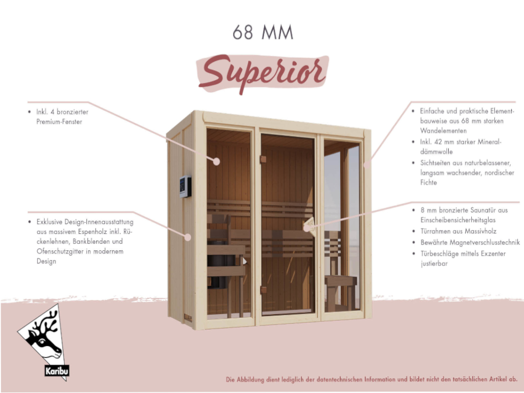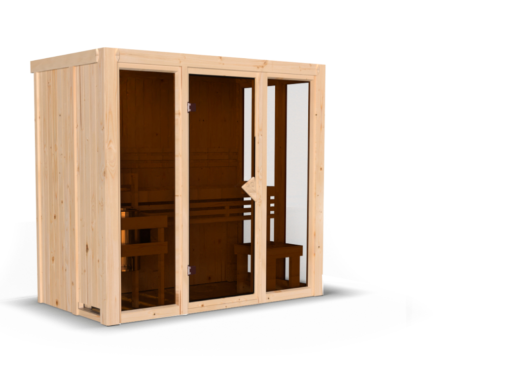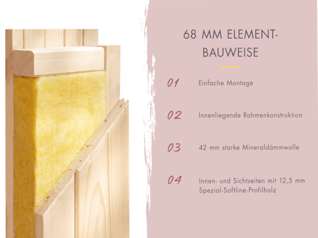 Dieses Saunamodell – eine System- bzw. Elementsauna – zeichnet sich durch seine besondere Sandwich-Bauweise aus, d. h., die Wandelemente bestehen aus einzelnen Schichten. Die bereits vorgefertigten Wandelemente aus Fichte ermöglichen einen schnellen Aufbau innerhalb weniger Stunden. Mit einer Wandstärke von 68 mm sind Systemsaunen optimal isoliert und somit besonders energiesparend. Wegen der sehr gut gedämmten Elemente heizt sich die Systemsauna extra schnell auf.