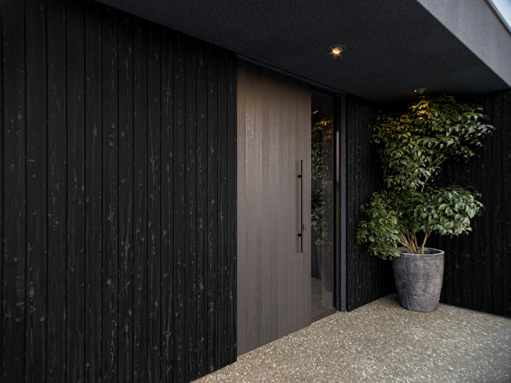 Bitte beachten: Da die Fassadenhölzer mit Feuer behandelt wurden, können sich Rußrückstände auf der Oberfläche befinden, die bei Berührung auf Kleidung und Hände abfärben können.