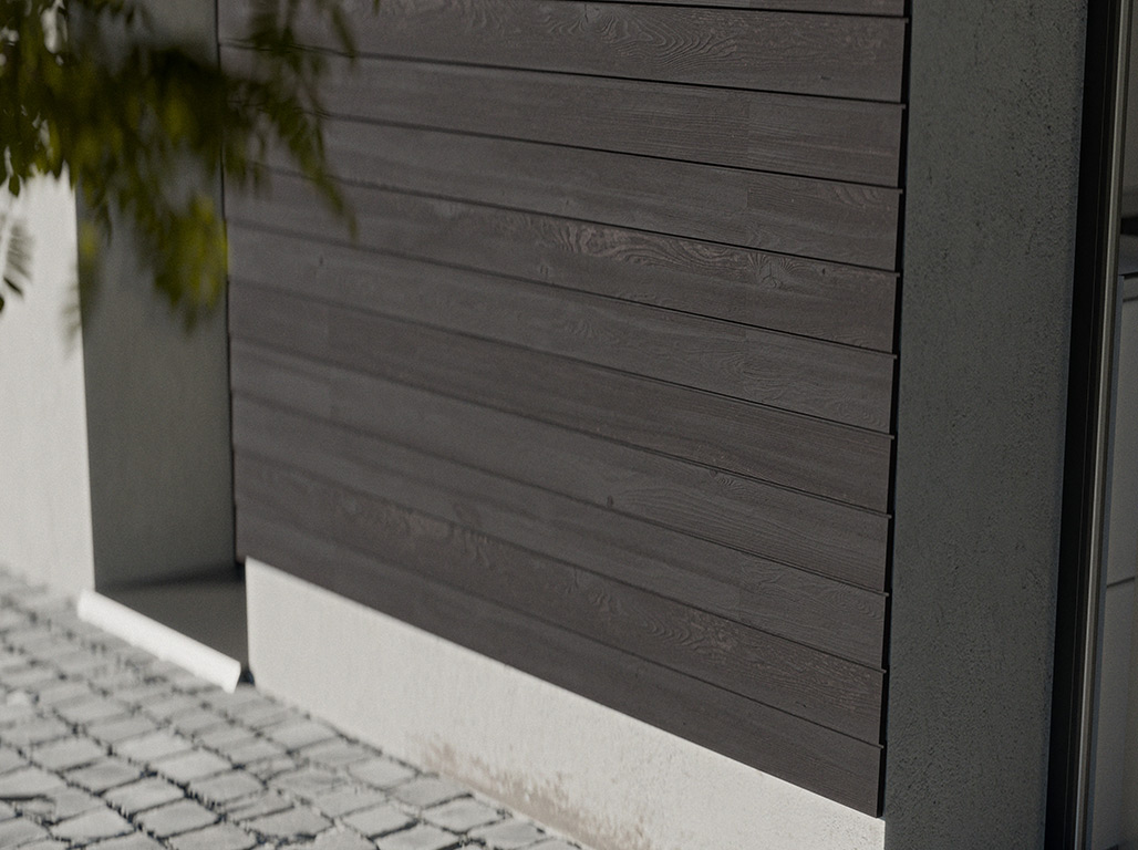 Die Fassade besteht aus gebranntem Holz – für eine hohe Widerstandsfähigkeit und Dauerhaftigkeit. Um der Fassade Festigkeit und Haltbarkeit zu verleihen und sie vor Umwelteinflüssen wie UV-Strahlen, Regen und Schädlingen zu schützen, wird das Holz mit Feuer behandelt. Shou Sugi Ban, eine seit 100 Jahren angewandte japanische Brenntechnik, bewahrt die Farbe und das Muster des Holzes und macht es stärker und widerstandsfähiger gegen Umwelteinflüsse. Zum Brennen der Oberfläche werden Brennöfen mit einer Temperatur von 1.000 °C verwendet. Die hohe Temperatur löst die verschiedenen organischen Bestandteile auf und schließt die Poren an der Oberfläche des Holzes. Nach dem Brennen des Holzes wird die verkohlte Schicht mit speziellen Schabern abgekämmt. Dieser Vorgang hinterlässt eine weiche Oberfläche, die die einzigartige Struktur des Holzes zur Geltung bringt.