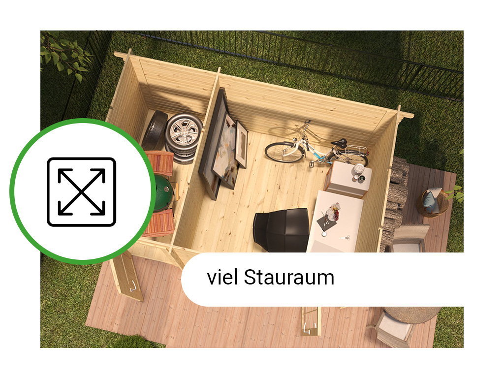 Die Grundfläche des Gartenhauses beträgt 9,08 m². Eine optimale Raumnutzung wird dank einer Firsthöhe von 220 cm gewährt.