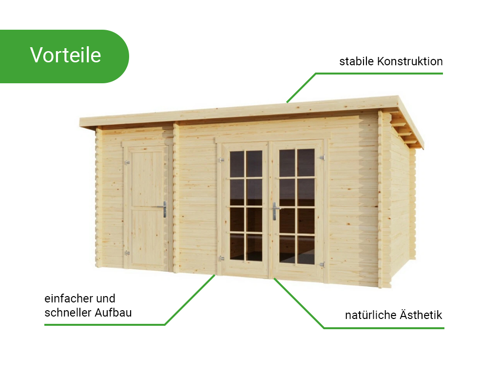 Gartenhaus Blockbohlenhaus Linz 19 mm...B x T x H: 420,1 x 238,5 x 211 cm, inkl. Boden + 150 cm Anbau + Doppeltür mit Lichtausschnitt