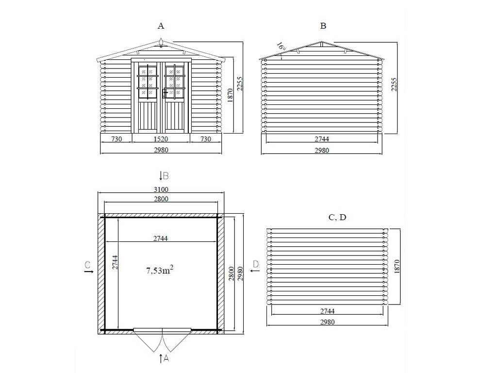 Die Grundfläche des Gartenhauses beträgt 8,18 m² mit einem Sockelmaß von 277,2 x 277,2 cm (B x T). Eine optimale Raumnutzung wird dank einer Firsthöhe von 225,5 cm gewährt.