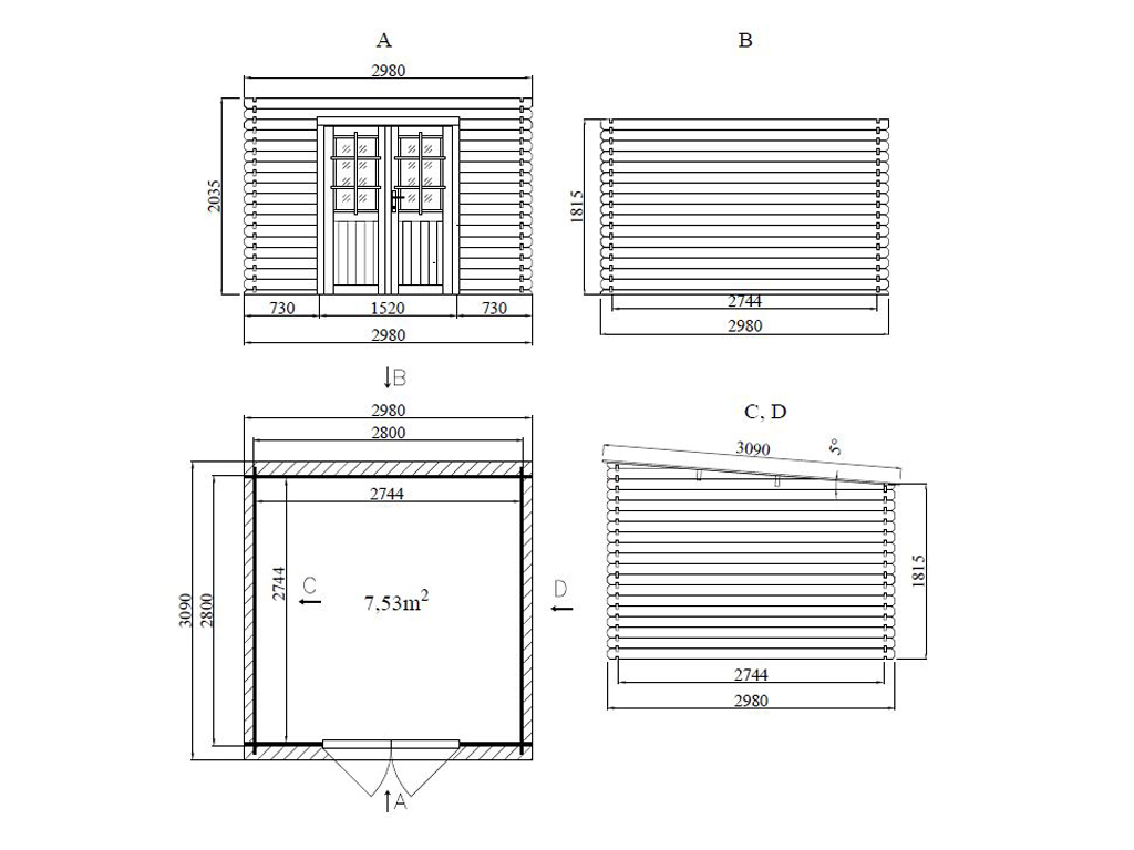 Außenmaß inkl. Dachüberstand (B x T): 298 x 309 cm