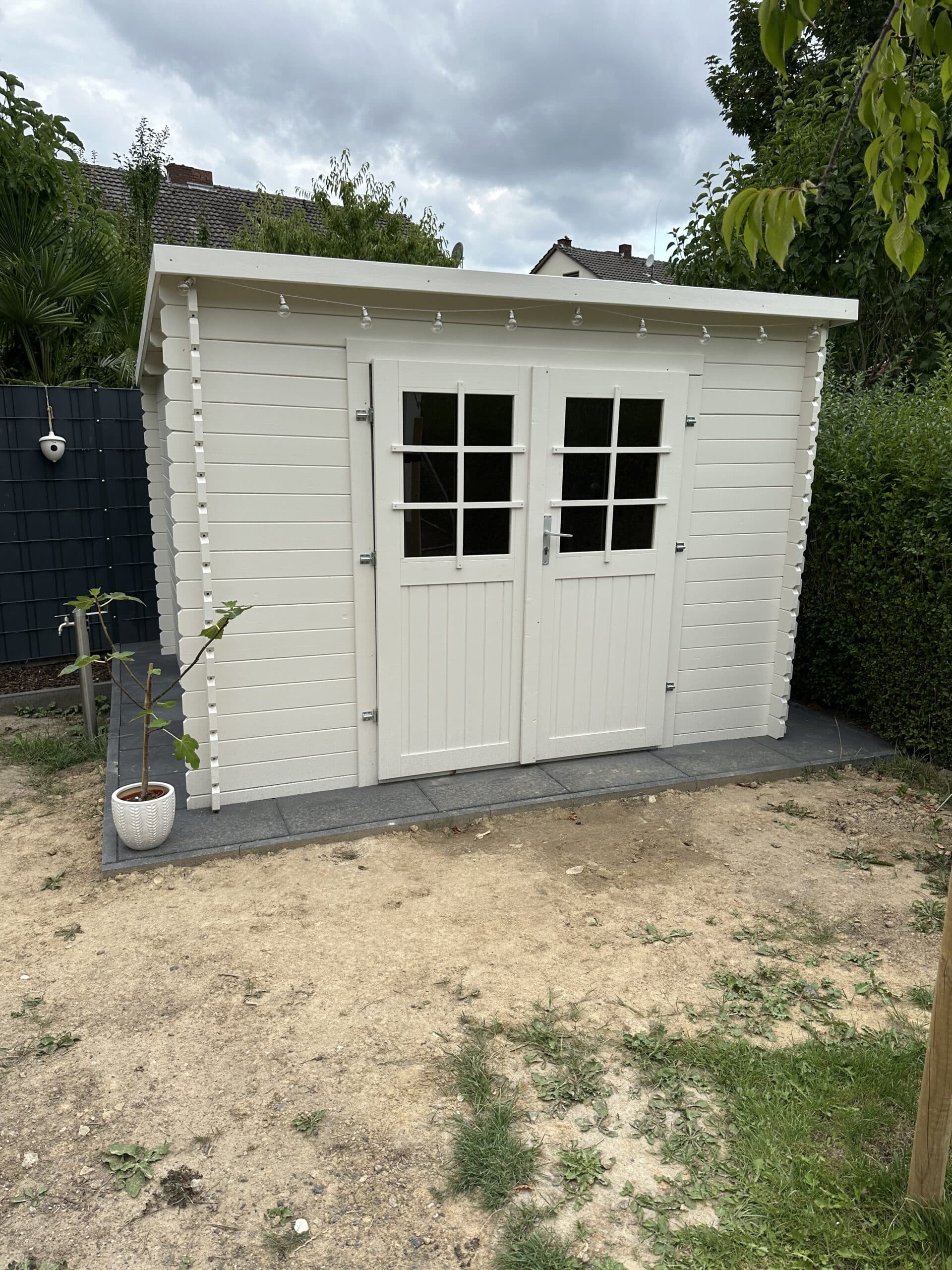Haus konnte gut an eine bestehende Gebäudenische angepasst werden. Material war so großzügig bemessen, dass das Dach vorgezogen werden konnte. Die Bohlen wurden direkt vor Positionierung gestrichen, da sie nachher nicht mehr erreichbar waren. Funktionierte gut. Wunderbarer Holzgeruch. Wird von allen Nachbarn bewundert ?