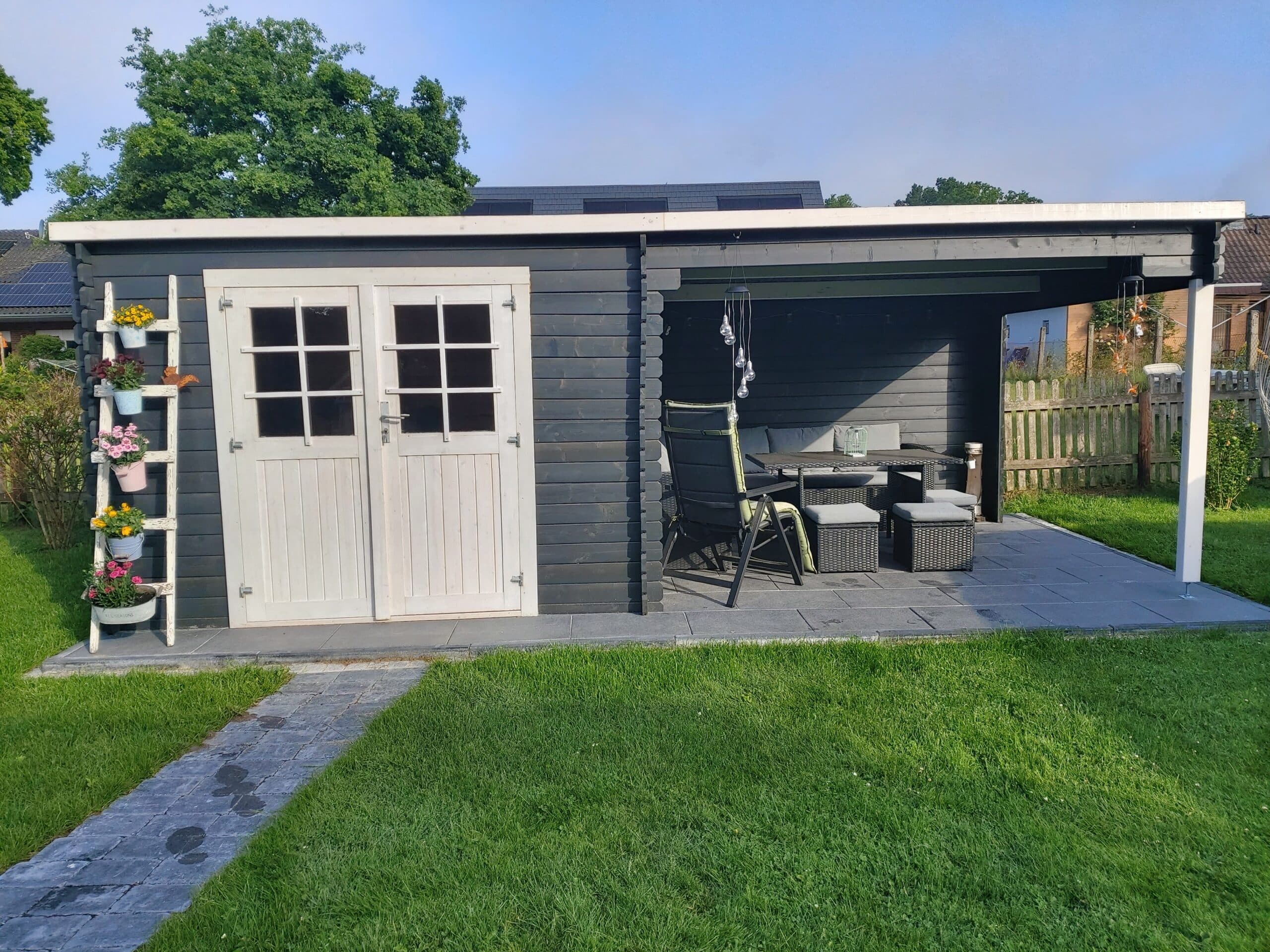 Dieses geräumige Gartenhaus besticht durch klare Formgebung, eine robuste Bauweise und dem großzügigen Anbau.