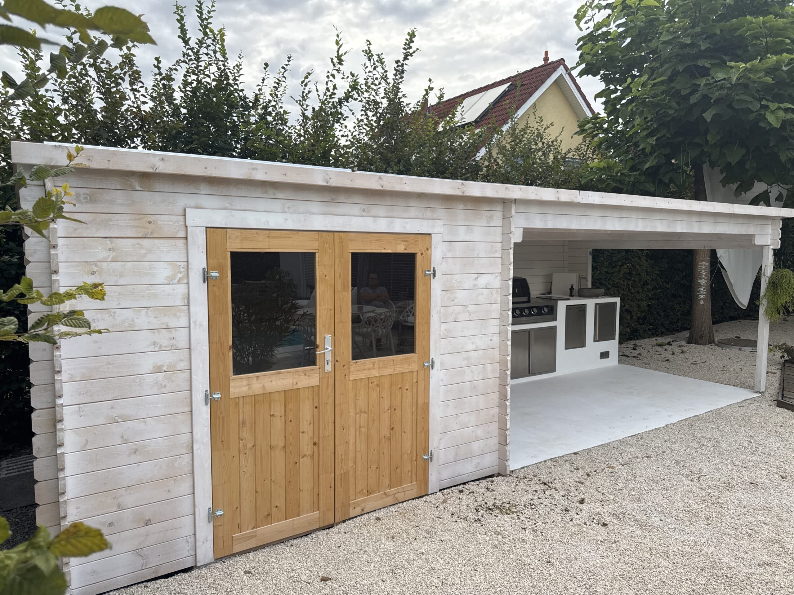 Von der Bestellung bis zur Lieferung lief alles reibungslos. Der Aufbau war sehr einfach und mit ein paar helfenden Händen ziemlich schnell erledigt. Man kann den Anbau je nach Wunsch rechts oder linksseitig der Hütte aufbauen.