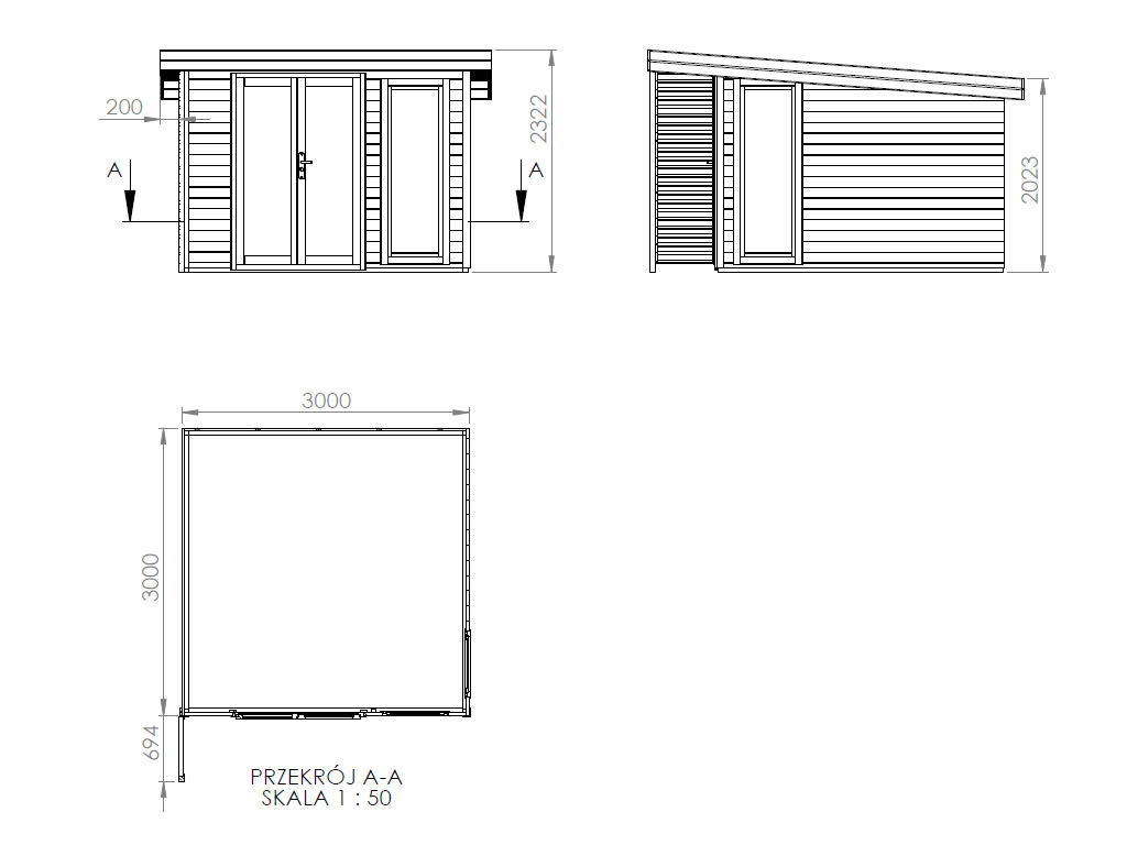 Die Grundfläche des Gartenhauses beträgt 9 m². Das Sockelmaß (Haus ohne Anbau) liegt bei 300 x 300 cm (B x T). Eine optimale Raumnutzung wird dank einer Firsthöhe von 232,2 cm gewährt.