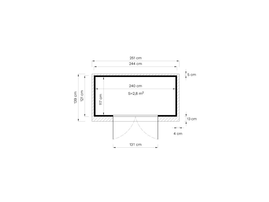 Die Grundfläche des Gartenhauses beträgt 2,96 m². Das Sockelmaß liegt bei 244 × 121 cm (B x T). Eine optimale Raumnutzung wird dank einer Firsthöhe von 210 cm gewährt.