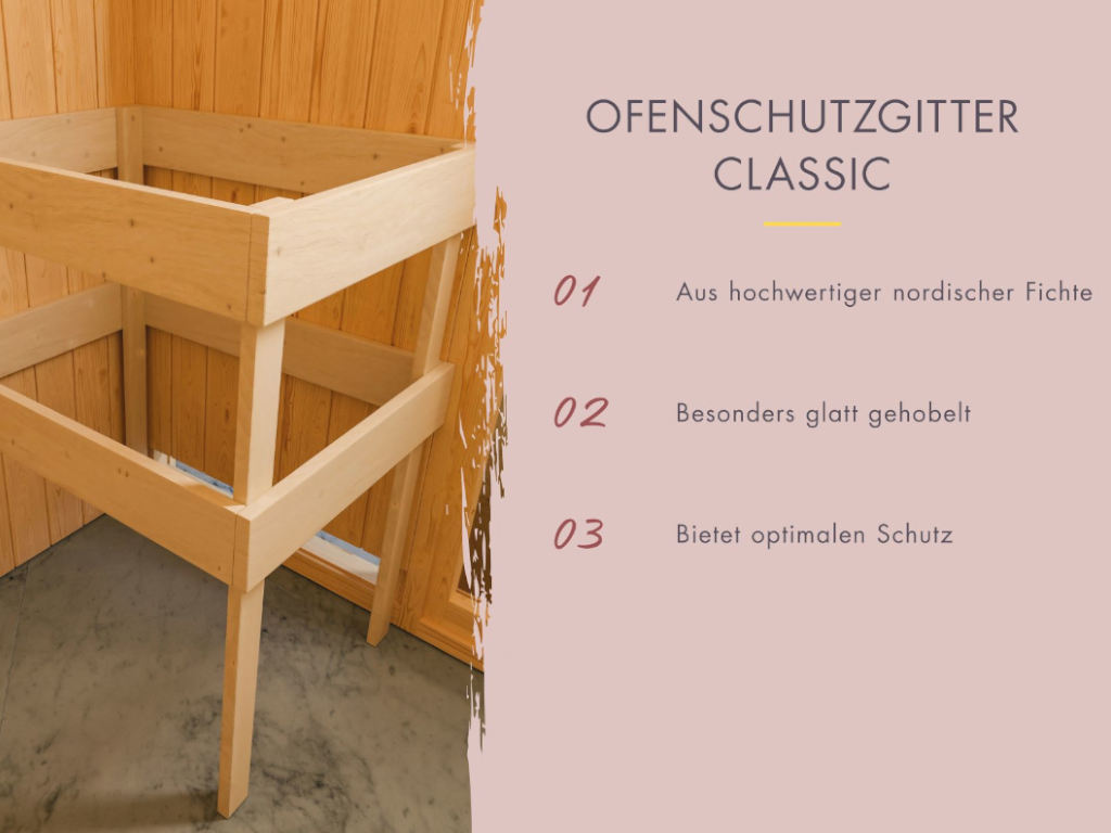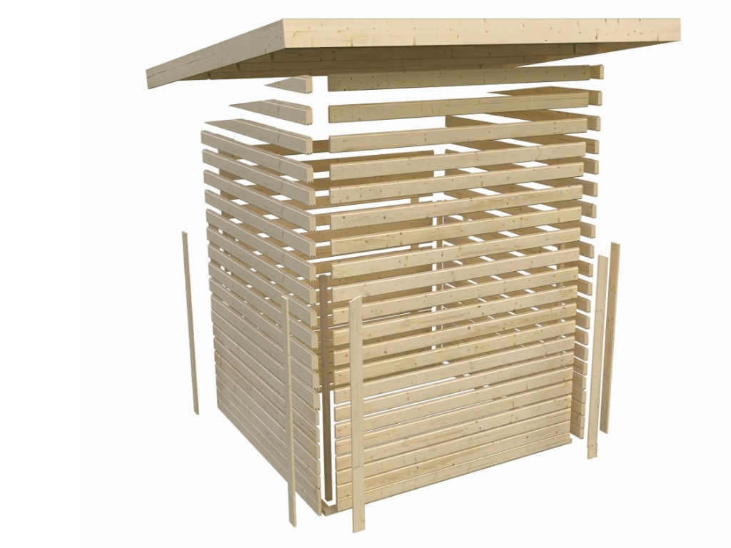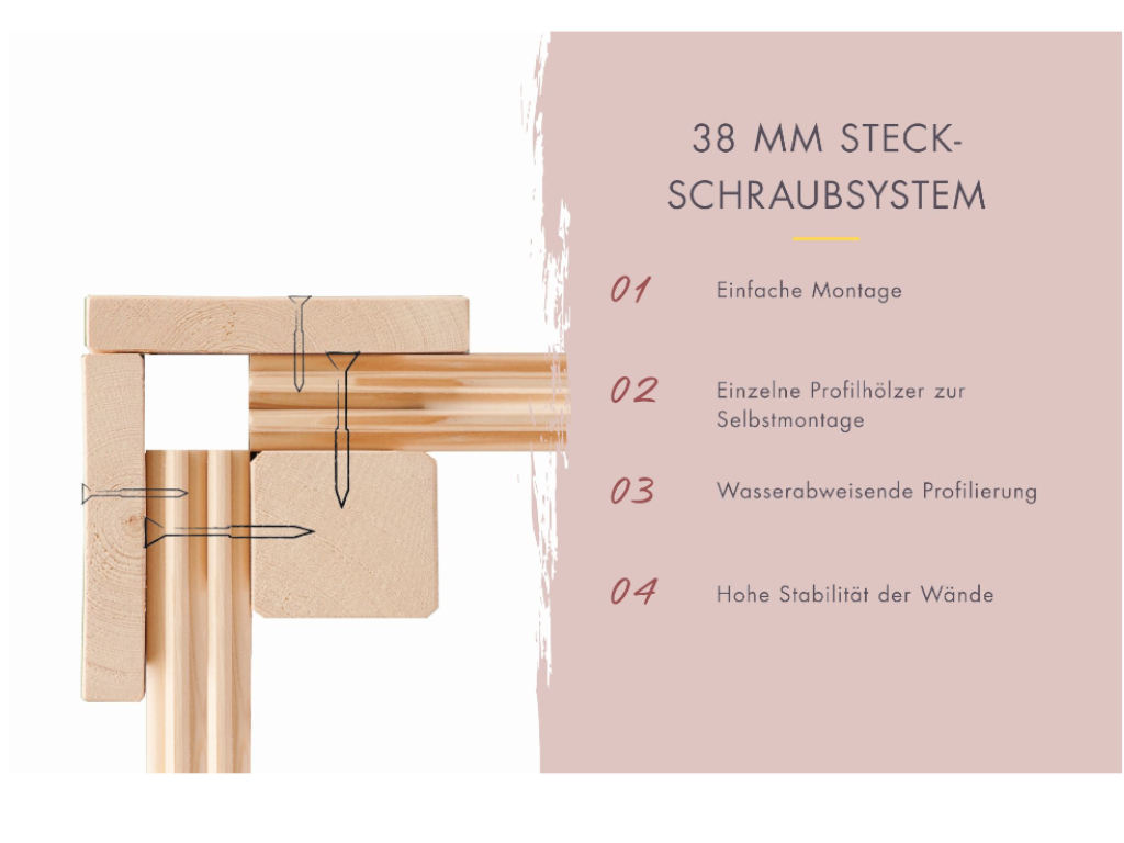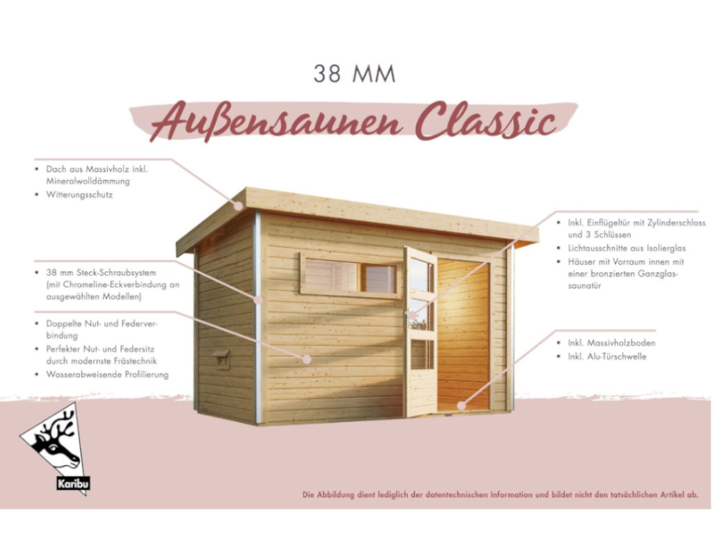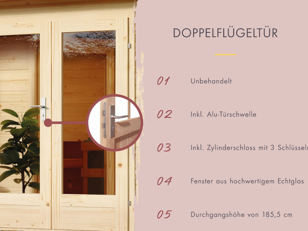 Lieferumfang: Saunahaus Mainburg 2, 2 Liegebänke, Massivholzboden, Unterkonstruktionshölzer, Zylinderschloss mit 3 Schlüsseln, Ofenschutzgitter aus Fichte