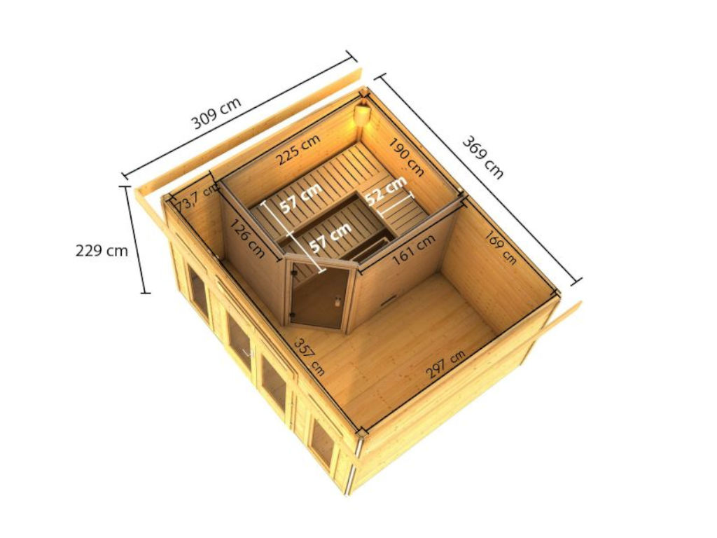 B x T x H: 369 x 309 x 229,5 cm, Fronteinstieg, inkl. kesseldruckimprägnierter Unterkonstruktionshölzer