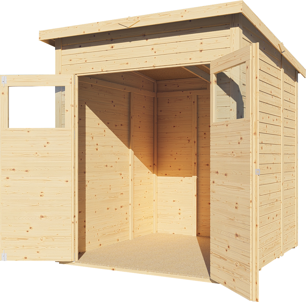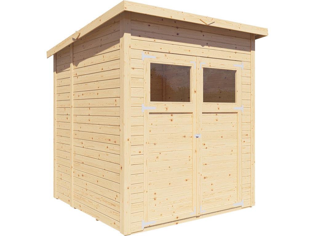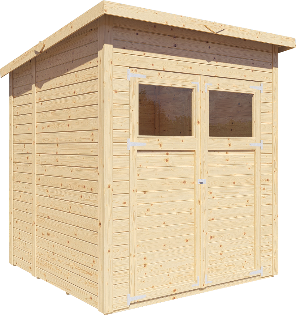 Ein modernes Pultdach aus Massivholz mit Nut- und Feder-Verbindung verleiht deinem Gartenhaus eine stilvolle, elegante Optik. Durch nur eine geneigte Dachfläche ist die Nutzungsfläche im Inneren des Gartenhauses deutlich weniger eingeschränkt und der Verlust an Nutzraum gering. Zudem lässt die Neigungsseite des Pultdaches das Regenwasser gut abfließen und es ist die Montage von nur einer Regenrinne nötig.
