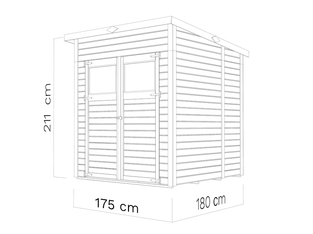Die Grundfläche des Gartenhauses beträgt 3,15 m². Das Sockelmaß (Haus ohne Anbau) liegt bei 174 x 180 cm (B x T). Das Sockelmaß liegt bei 174 x 180 cm (B x T). Eine optimale Raumnutzung wird dank einer Firsthöhe von 211 cm gewährt.