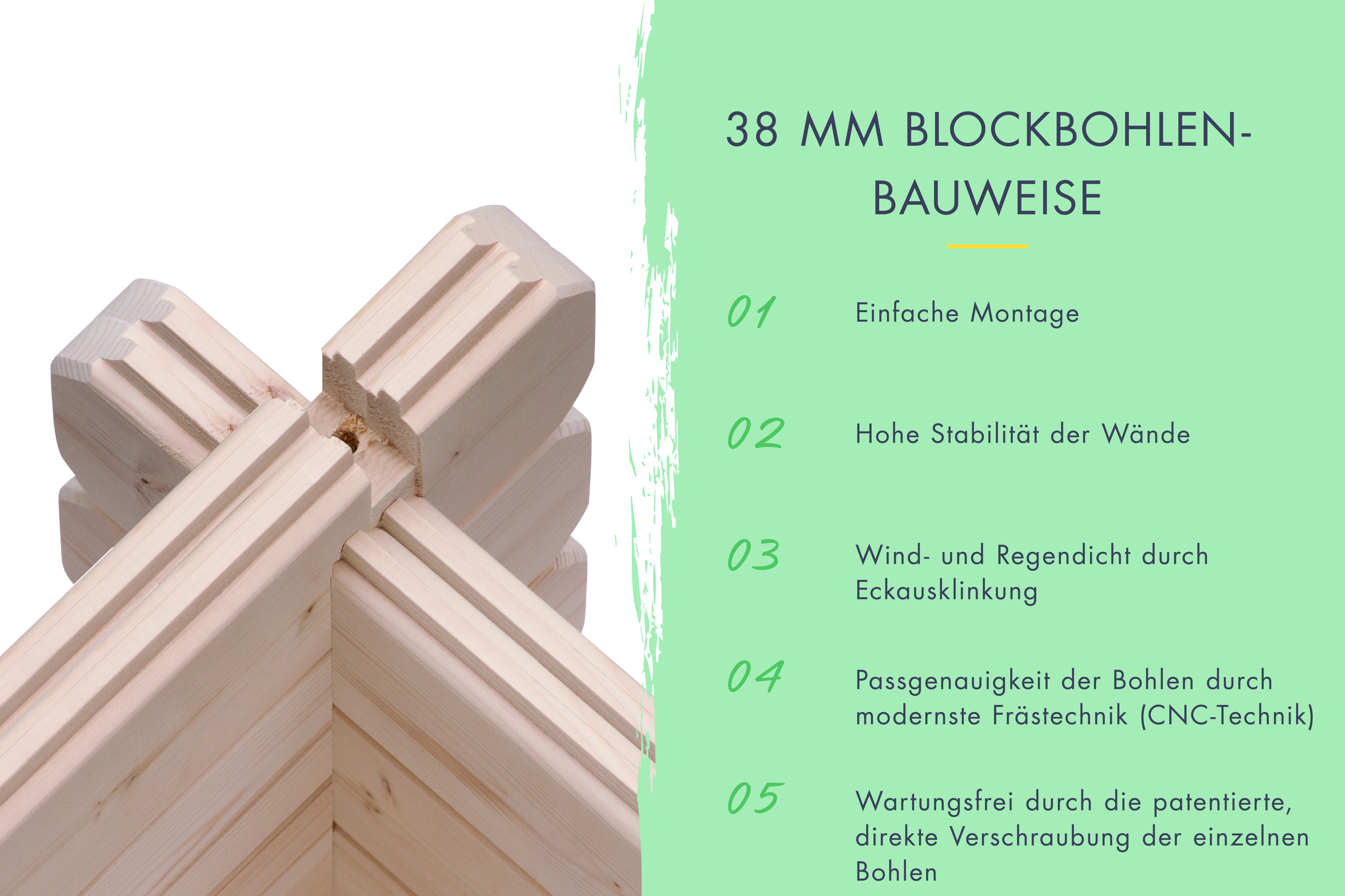 Die Wände des Blockbohlenhauses setzen sich aus vorgefertigten Holzbohlen zusammen, die dank einer Nut- und Feder-Verbindung ohne größere Anstrengungen aufeinandergesteckt werden können. Damit ist ein einfacher und schneller Auf- und Abbau garantiert. An der Kopfseite des Gartenhauses sorgt die charakteristische Verkämmung (spezielle Einkerbungen im Holz) nicht nur für eine einzigartige Optik, sondern hält das ganze Konstrukt auch zusammen und macht es absolut wind- und wetterfest.