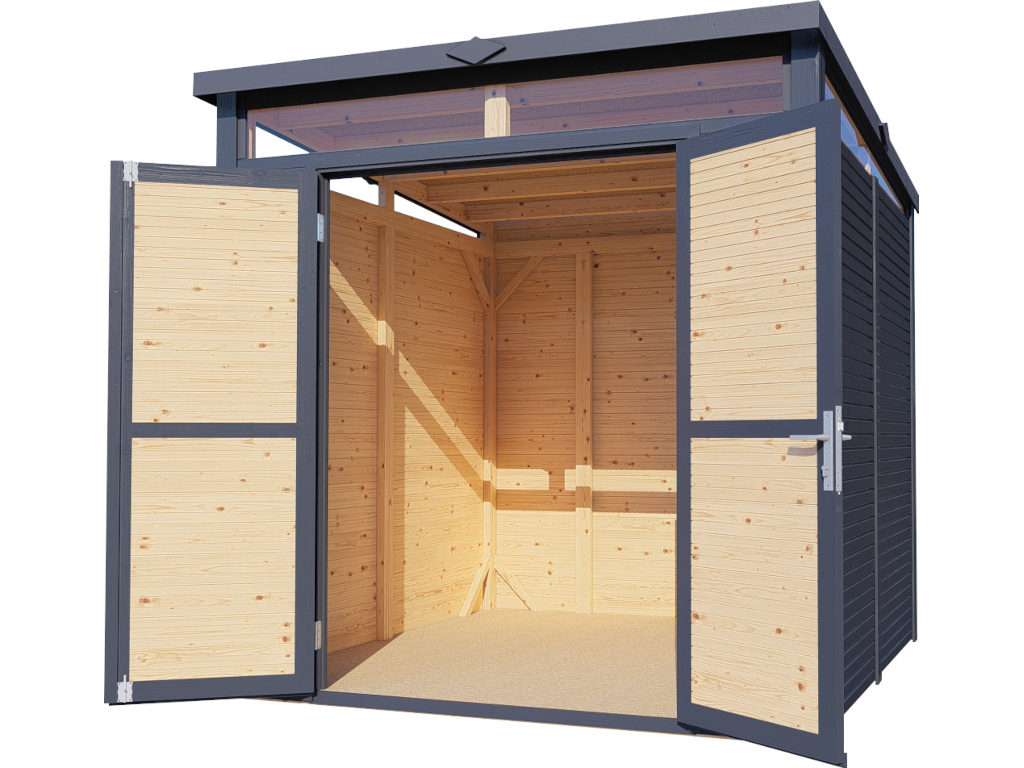 Ein modernes Pultdach aus Massivholz mit Nut- und Feder-Verbindung verleiht deinem Gartenhaus eine stilvolle, elegante Optik. Durch nur eine geneigte Dachfläche ist die Nutzungsfläche im Inneren des Gartenhauses deutlich weniger eingeschränkt und der Verlust an Nutzraum gering. Zudem lässt die Neigungsseite des Pultdaches das Regenwasser gut abfließen und es ist die Montage von nur einer Regenrinne nötig.