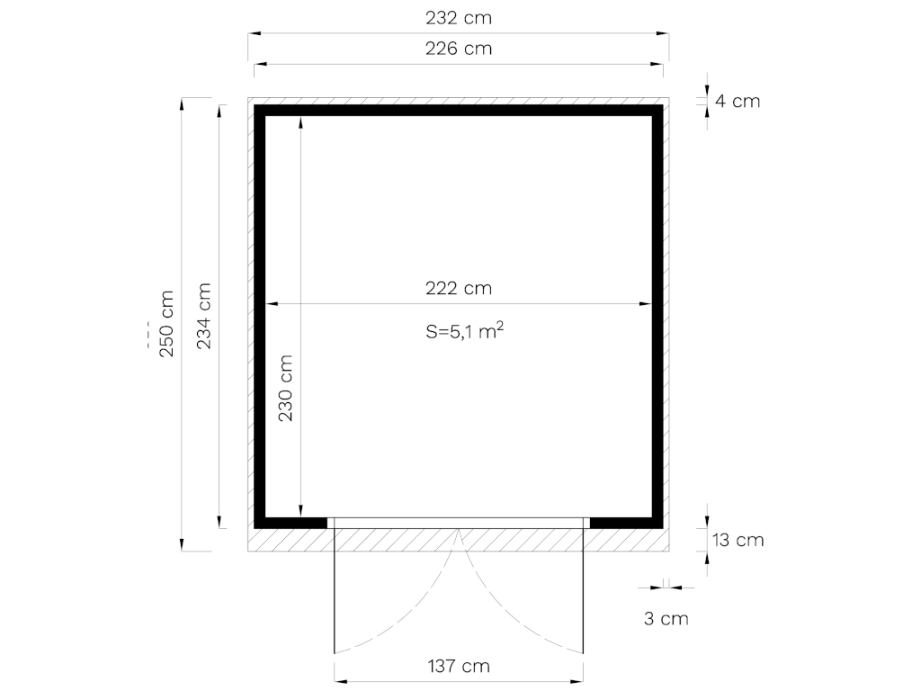 Die Grundfläche des Gartenhauses beträgt 5,11 m². Das Sockelmaß liegt bei 226 x 234 cm (B x T). Eine optimale Raumnutzung wird dank einer Firsthöhe von 232 cm gewährt.