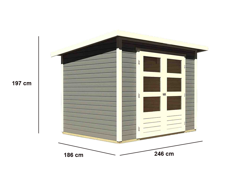 B x T x H: 246 x 186 x 197 cm, Sockelmaß Haus: B x T: 242 x 182 cm, inkl. Doppelflügeltür mit Lichtausschnitten
