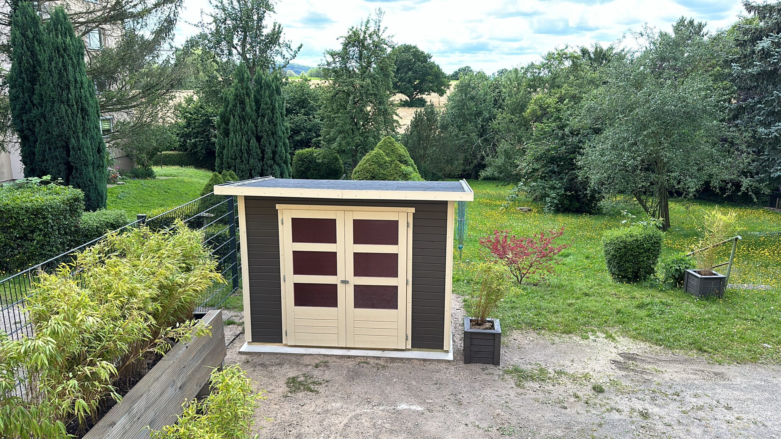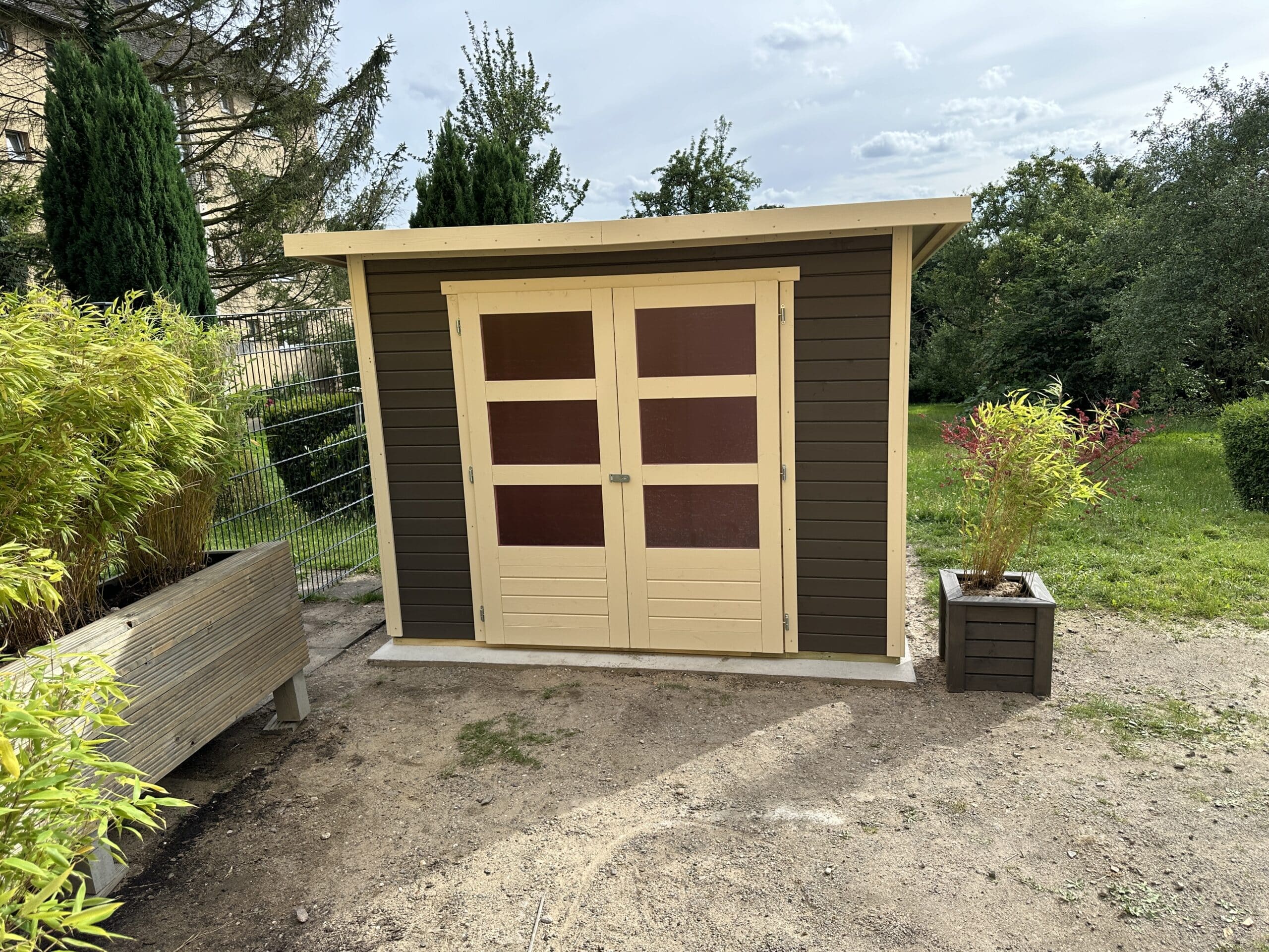 Geräumiges Gartenhaus mit Doppelflügeltür und modernem Pultdach.