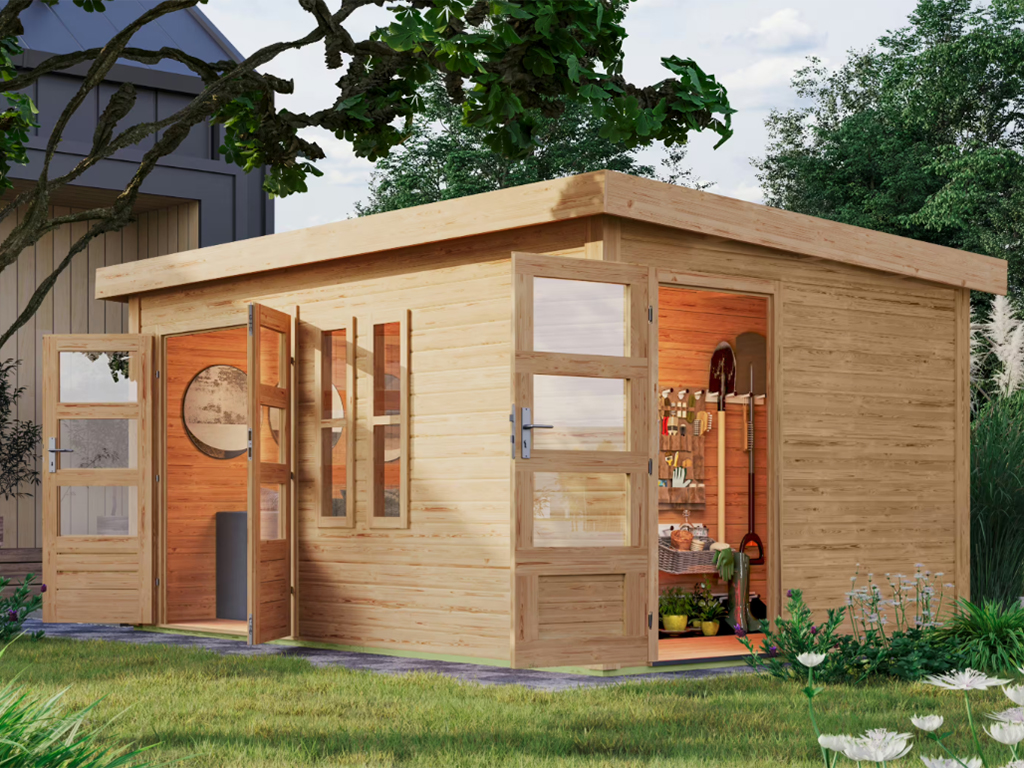 Dieses 2-Raum-Gartenhaus bietet viel Platz für eine multifunktionale Nutzung. Die durch eine Trennwand geschaffenen zwei Räume mit separaten Eingängen ermöglichen dir, das Gartenhaus sowohl als gemütlichen Rückzugsort als auch als Stauraum für Gartengeräte zu nutzen.
