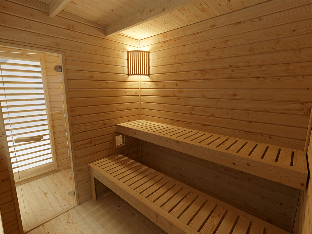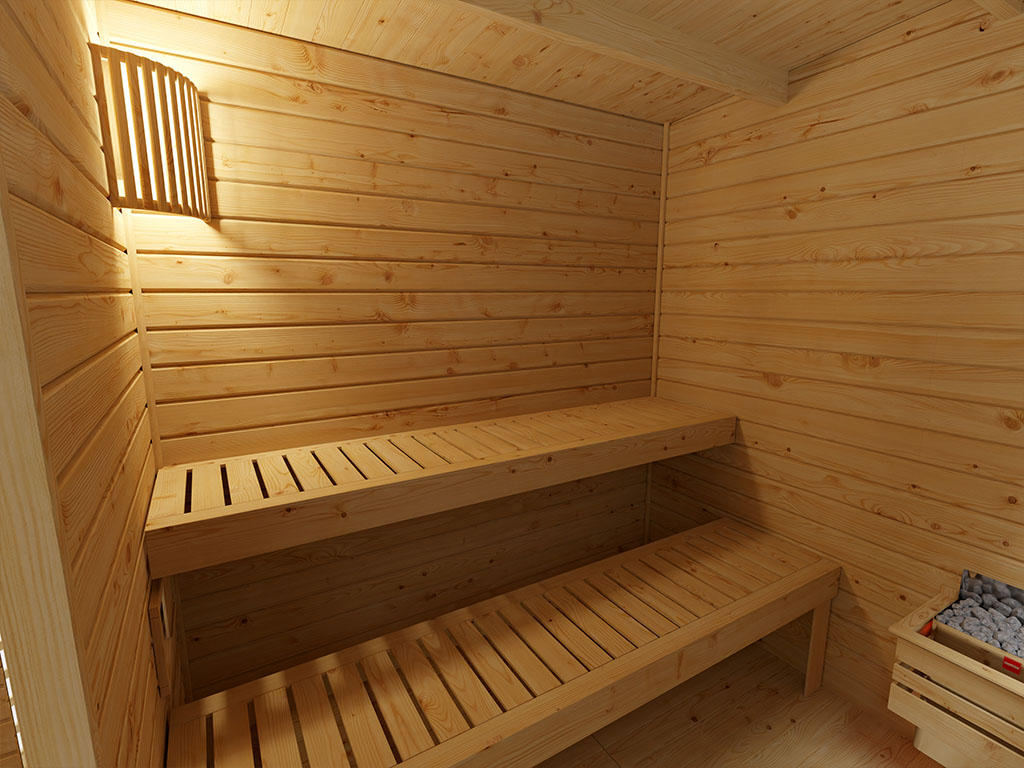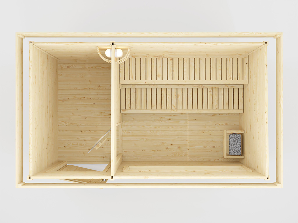 | Lieferumfang: | 2 Liegen, 2 Kopstützen, Ofenschutzgitter, 2 Saunaleuchten, Dachpappe |