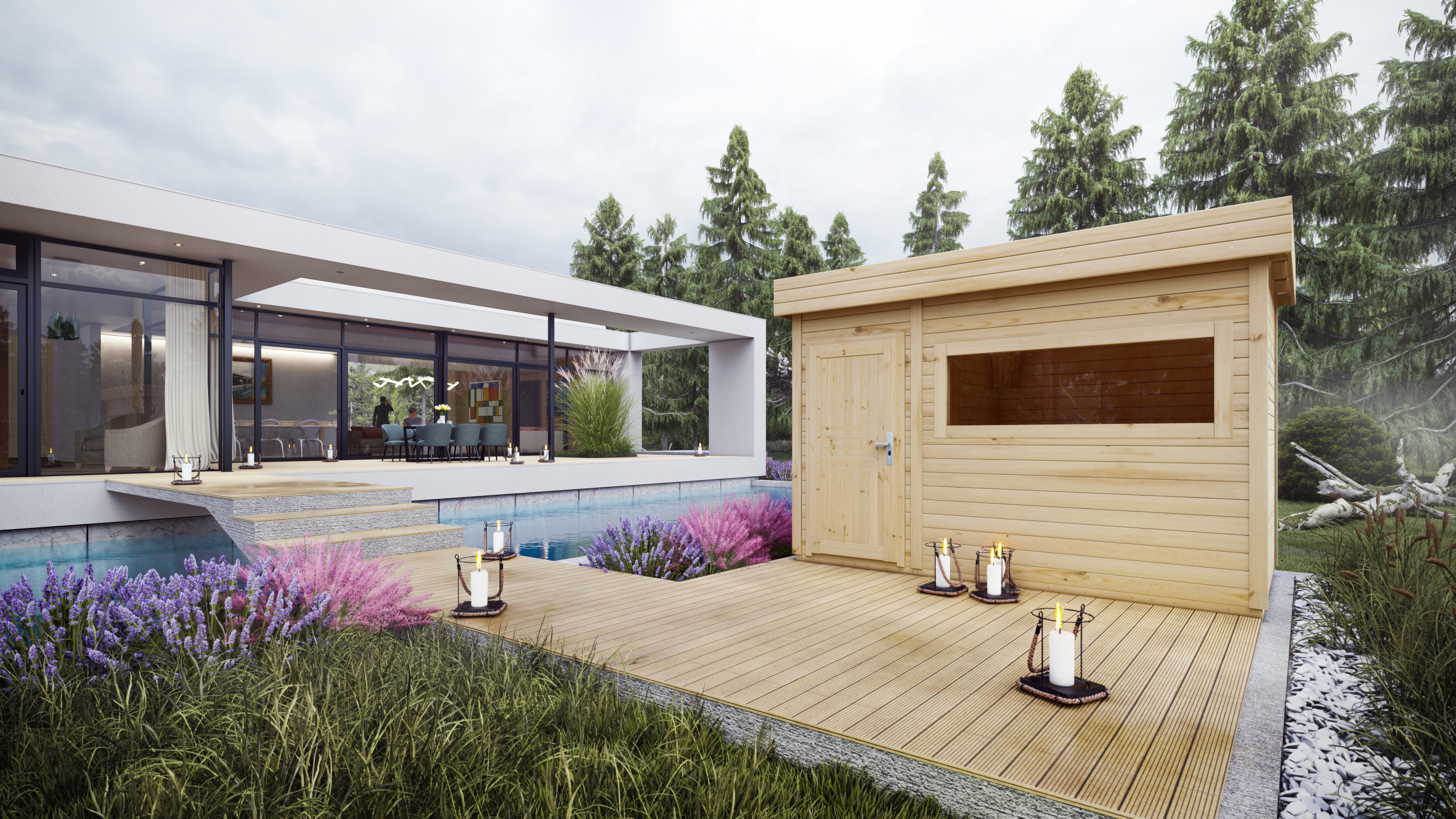 Diese Elementsauna verdankt ihren Namen den einzelnen vorgefertigten Wandelementen, die beim Aufbau einfach nur zusammengesteckt werden. Das ermöglicht einen schnellen und einfachen Aufbau.