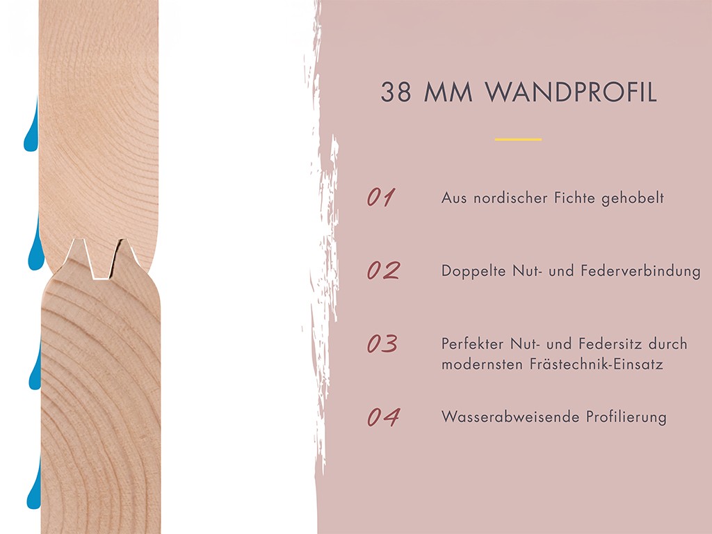 • Bodenrost aus fußwarmem Fichtenholz: für angenehmes Auftreten innerhalb und außerhalb der Sauna.