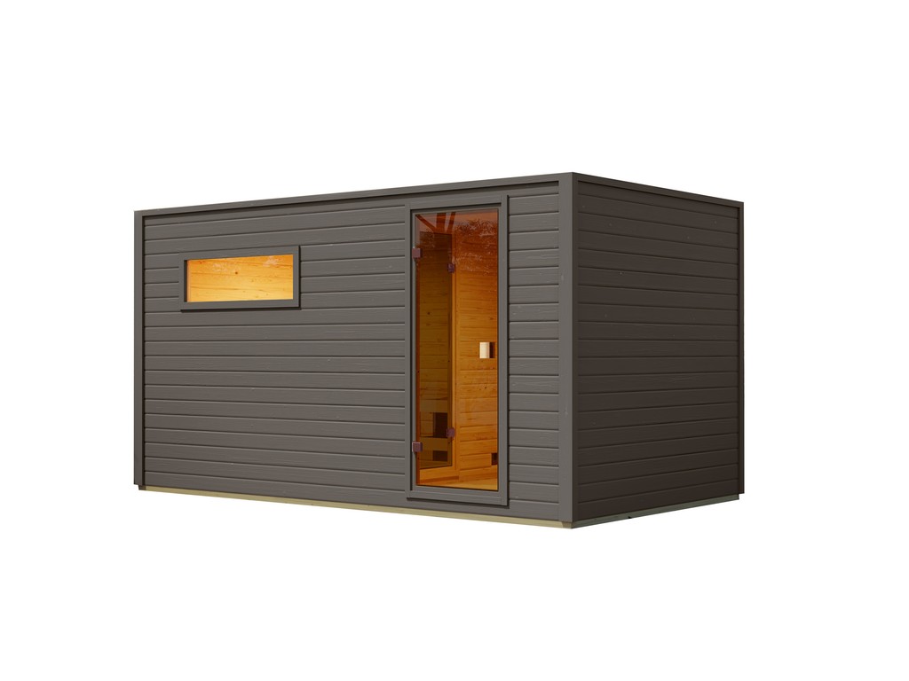 Saunahaus Cuben 38 mm terragrau inkl. 9 kW...B x T x H: 276 x 276 x 210 cm, inkl. 3 Liegen, inkl. 9 kW Saunaofen + ext. Steuerung