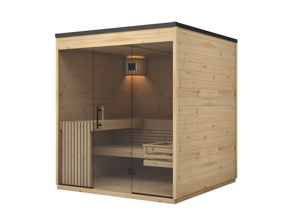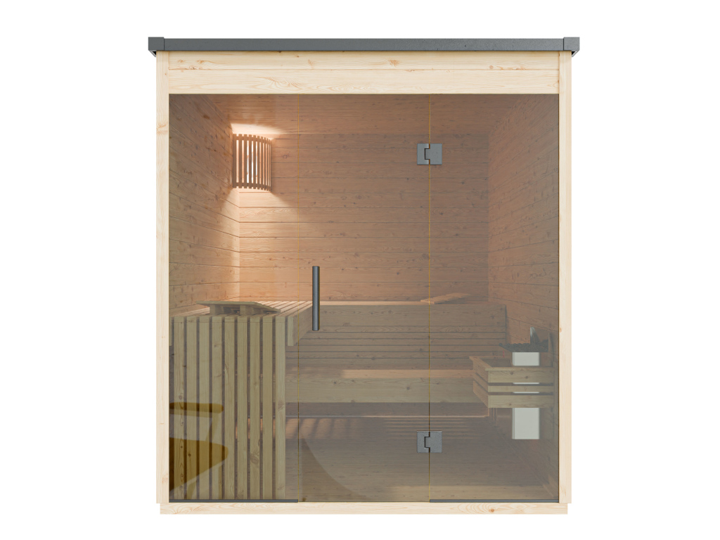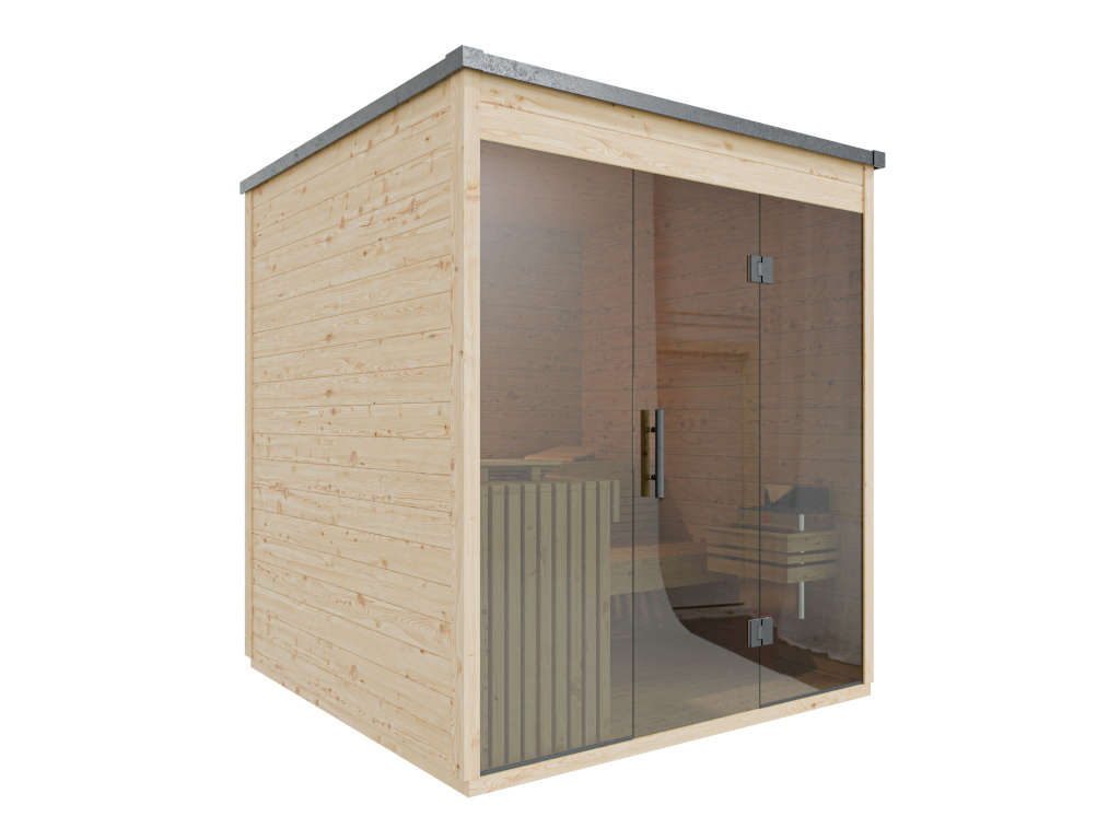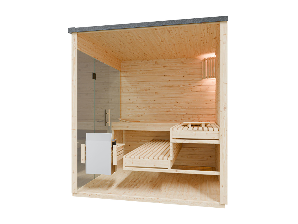 Saunahaus Mikka mit KlarglastürB x T x H: 231 x 196 x 226 cm, Eckeinstieg, inkl. 3 Liegen