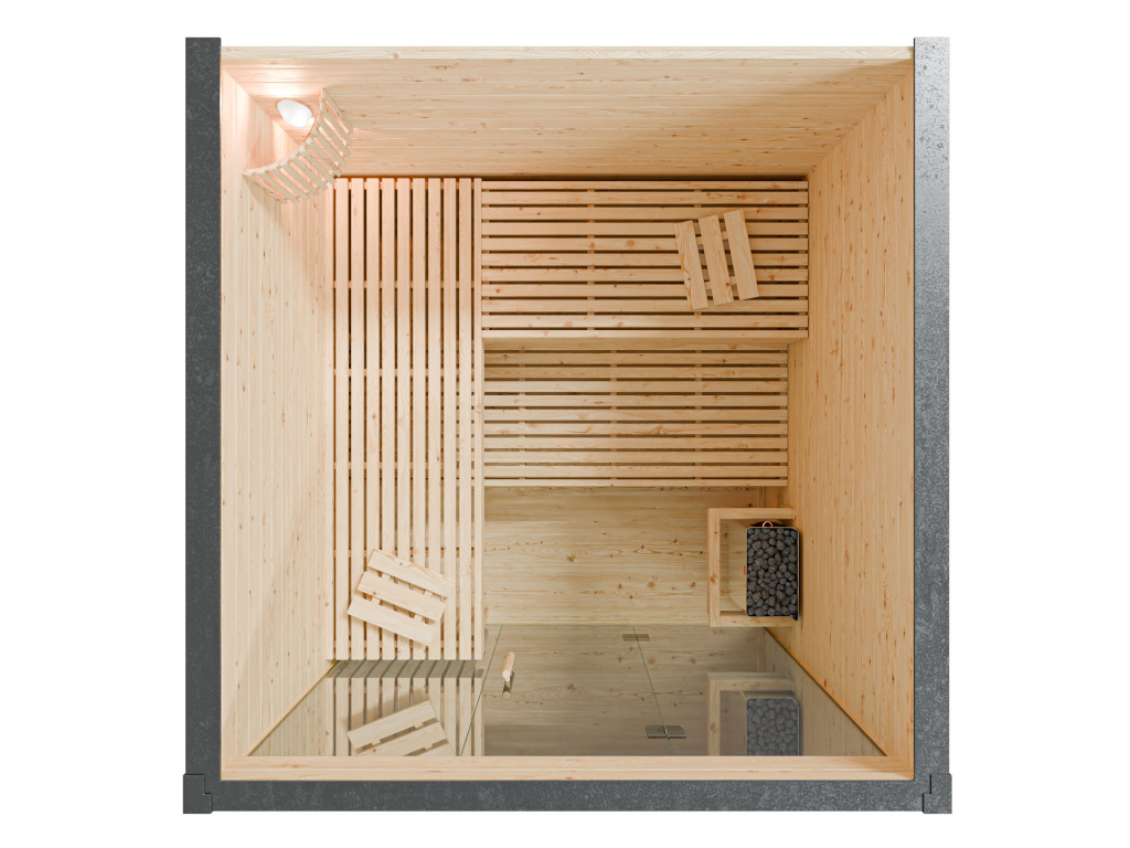 Lieferumfang: 3 Liegen, 9 kW Ofen, Steine, int. Steuerung, Ofenschutzgitter aus massivem Fichtenholz (B 60 x T 51 x H 80 cm), Beschläge & Montageanleitung.