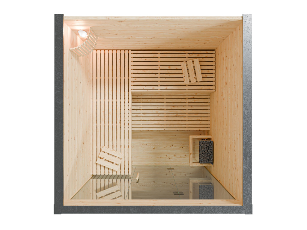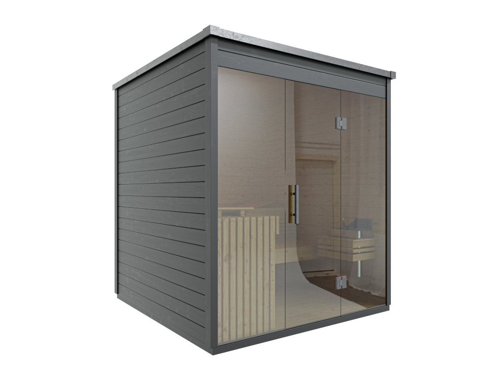 Die Sauna verfügt über eine Graphit-Ganzglastür.