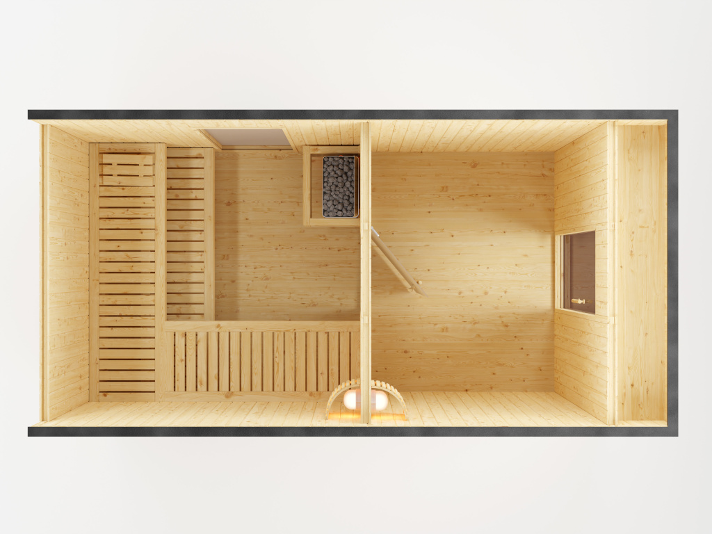 Die Wände der Sauna bestehen aus 72 mm dicken Modulen, die mit 40 mm dicker Mineralwolle isoliert sind.