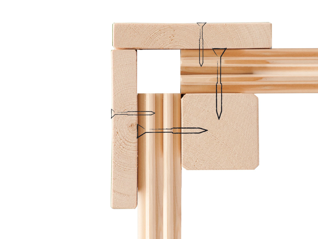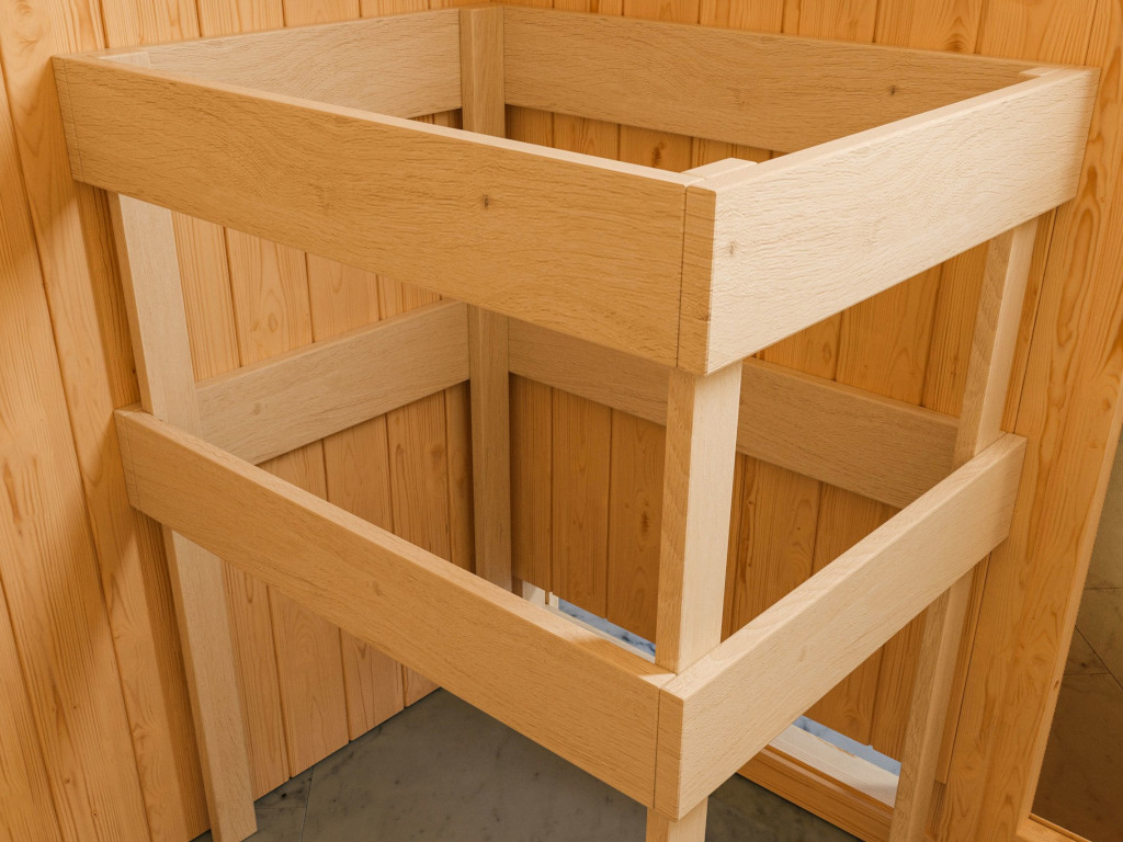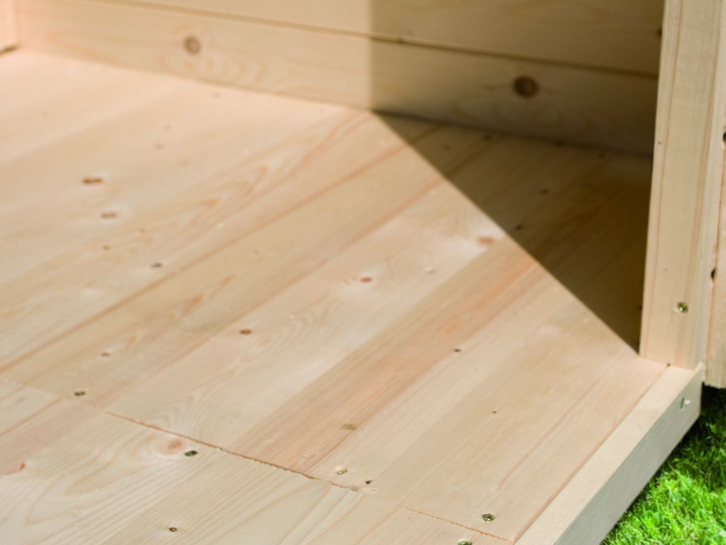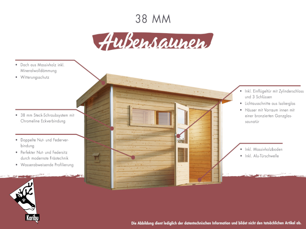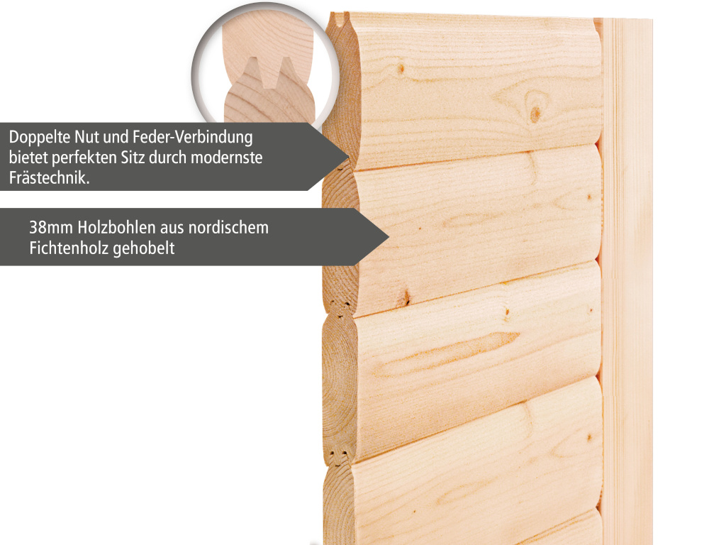 Das Saunahaus aus besten 38 mm starken Wandbrettern aus nordischer Fichte wird im Steck-/Schraubsystem montiert. Mit einem Gesamtmaß von 231 cm x 196 cm bietet es genügend Platz für ungestörte Wellnessstunden im eigenen Garten. Der Saunaraum ist mit einer Fläche von 219 cm x 184 cm natürlich ebenfalls ausreichend dimensioniert. Innen bieten 3 Saunabänke Platz zur Entspannung. Das formschöne und praktische Dach sorgt für den Witterungsschutz von oben. Für den nötigen Abstand zum Erdreich sorgen kesseldruckimprägnierte Bodenbalken. Auf diese werden die Wandbretter und die Nut- und Federbretter des Fußbodens montiert. Ein Ofenschutzgitter und alle notwendigen Schrauben und Beschläge sowie eine aussagekräftige Montageanleitung sind selbstverständlich ebenfalls dabei.