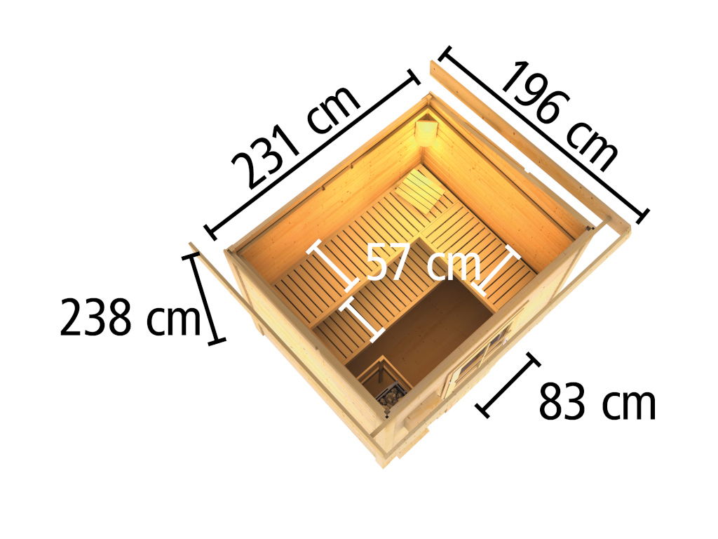B x T x H: 231 x 196 x 238 cm, ohne Ofen, inkl. 3 Liegen